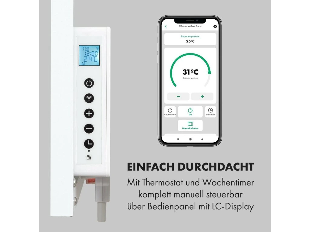 - Naozaj premyslený: s termostatom a týždenným časovačom, ovládateľný kompletne manuálne prostredníctvom ovládacieho panela s LCD displejom