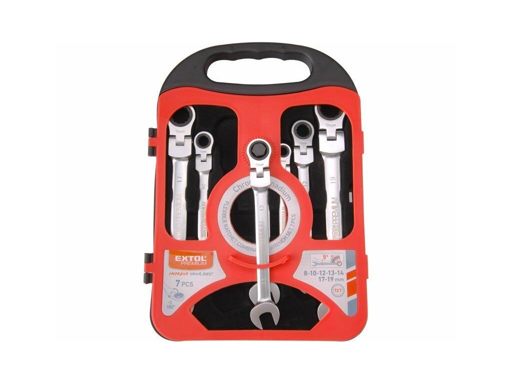 Klíče ráčnové očkoploché s kloubem, 7ks, 8-10-12-13-14-17-19, ráčna 72 zubů, EXTOL PREMIUM