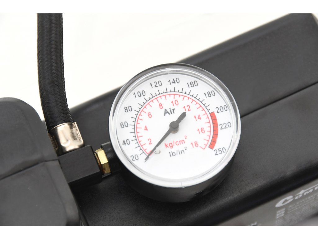 Kompresor je vybavený vstavaným tlakomerom, ktorý zobrazuje nameraný tlak v niekoľkých jednotkách.