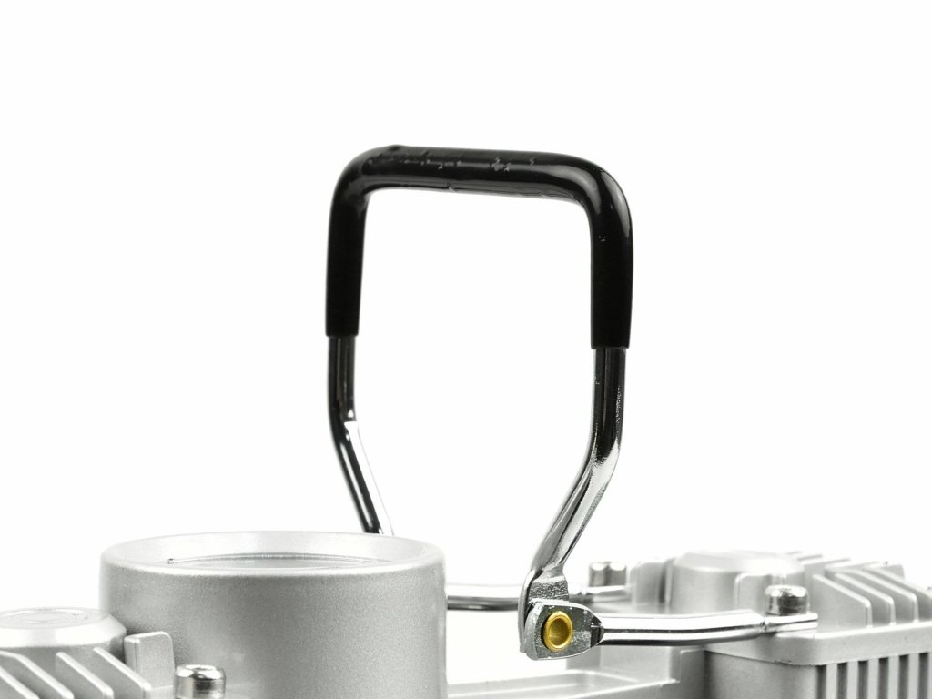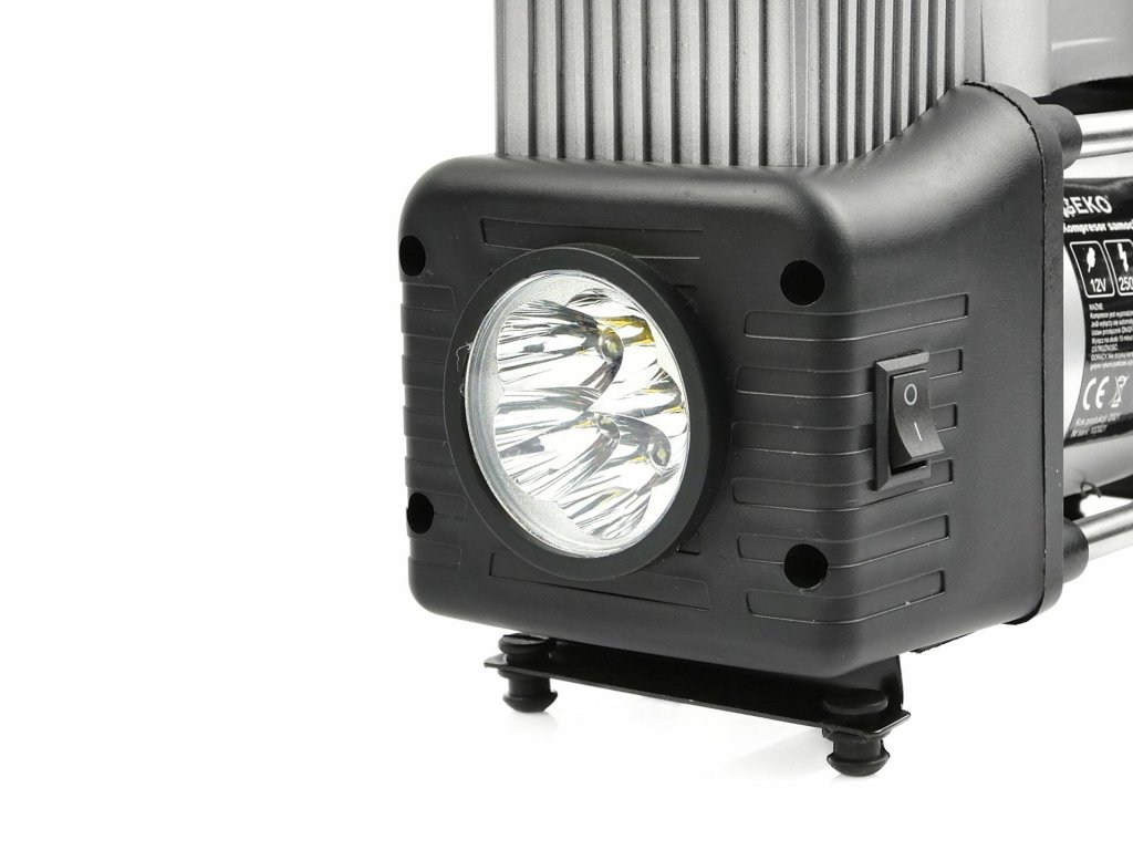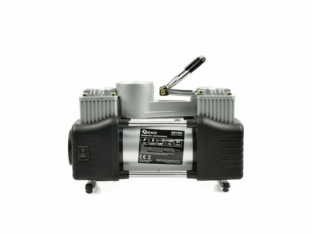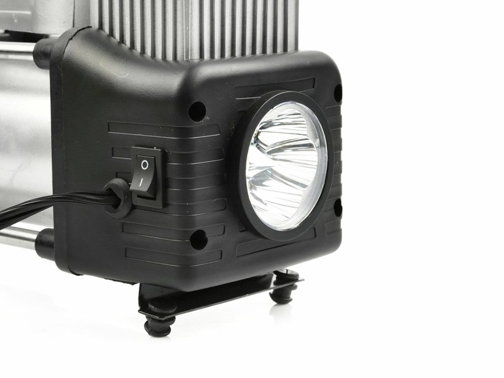 Kompresor do auta napájený napětím 12-13,5 V ze zásuvky zapalovače nebo přímo z baterie. Vybaveno čitelným ocelovým manometrem ve třech jednotkách: Bar, PSI a kg / cm2 . Má šroubovací hrot přizpůsobený autoventilkům, které se používají i u motocyklů a jízdních kol. Vestavěná svítilna umožňuje pohodlné používání kompresoru v noci, bez potřeby dalšího zdroje světla. Navíc sada obsahuje pneumatickou spirálovou hadici a sadu tří trysek pro nafukování míčů, matrací atd. Vyfouknutá kola na autě, kočárku nebo cyklokole již nemusí být problém, vaše auto může být vybaveno malým přenosným kompresorem, který dokáže díky univerzálním koncovkám nafoukat balón, nafukovací člun nebo i bečku od piva...Hlavní výhody: