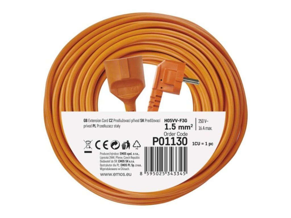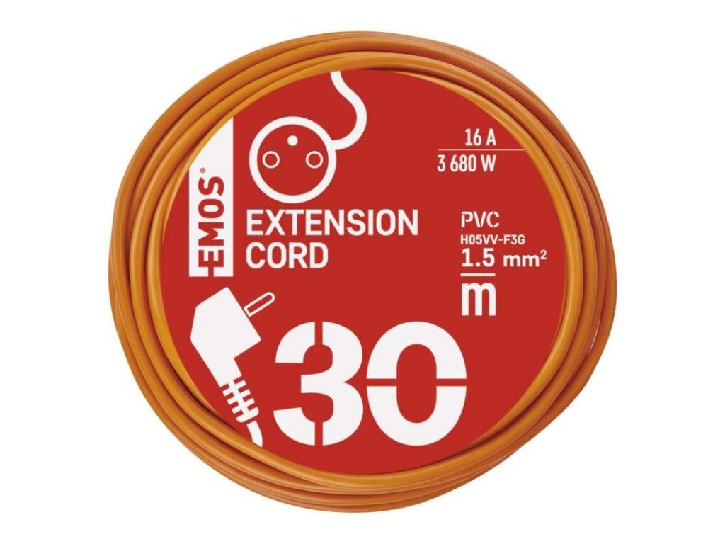 Oranžový predlžovací kábel, 1 ks s dĺžkou 30 m a prierezom vodičov 1,5 mm2