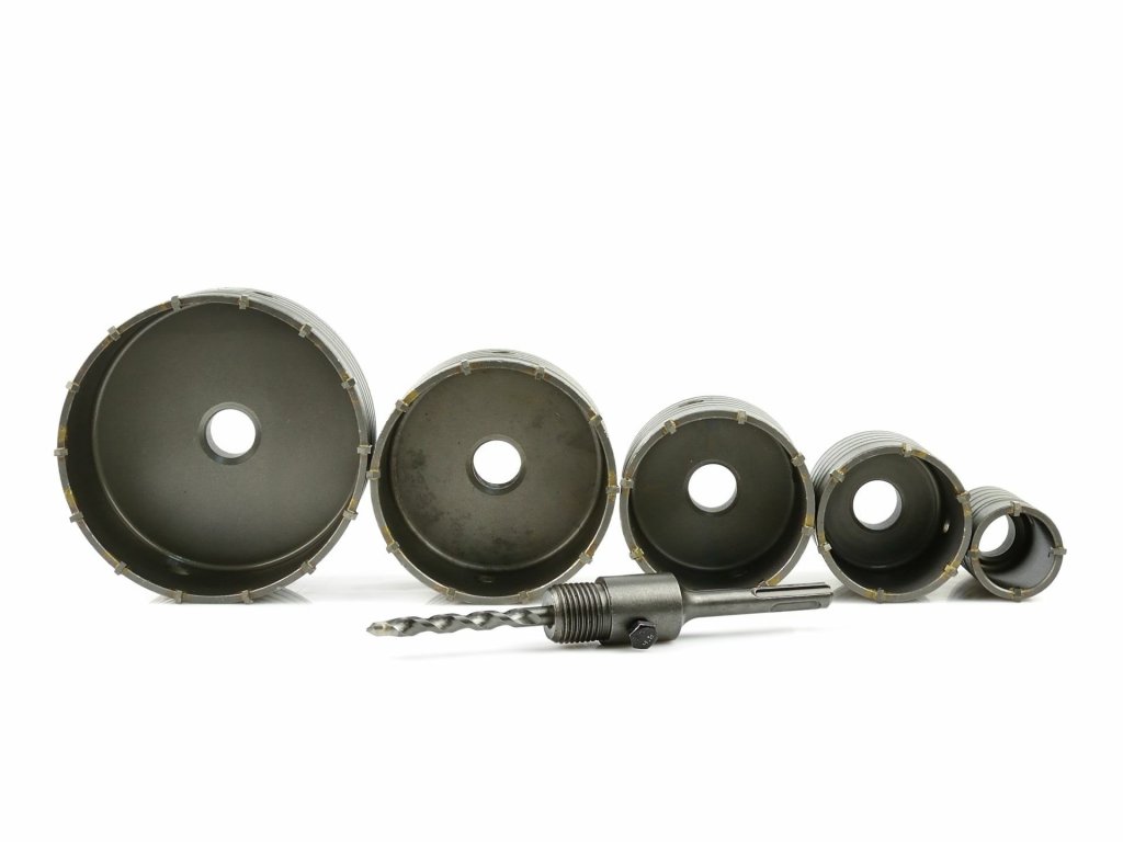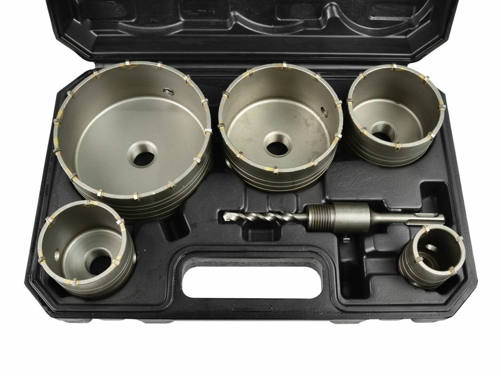 Sada praktických vykružovacích vrtáků je vyrobena z nejkvalitnějších materiálů. Ozubené jádro vrtáků je vyrobeno z karbidu. Souprava obsahuje adaptér s vodícím vrtákem, který je určen k použití s vrtačkami s upínáním SDS-Plus. Tento typ vrtáků je určen k vrtání otvorů pro elektroinstalace (krabice, zásuvky) do různých typů stavebních materiálů, jako jsou beton, sádrokartonové desky, sádrovláknité desky, cihly s obklady.Hlavní výhody