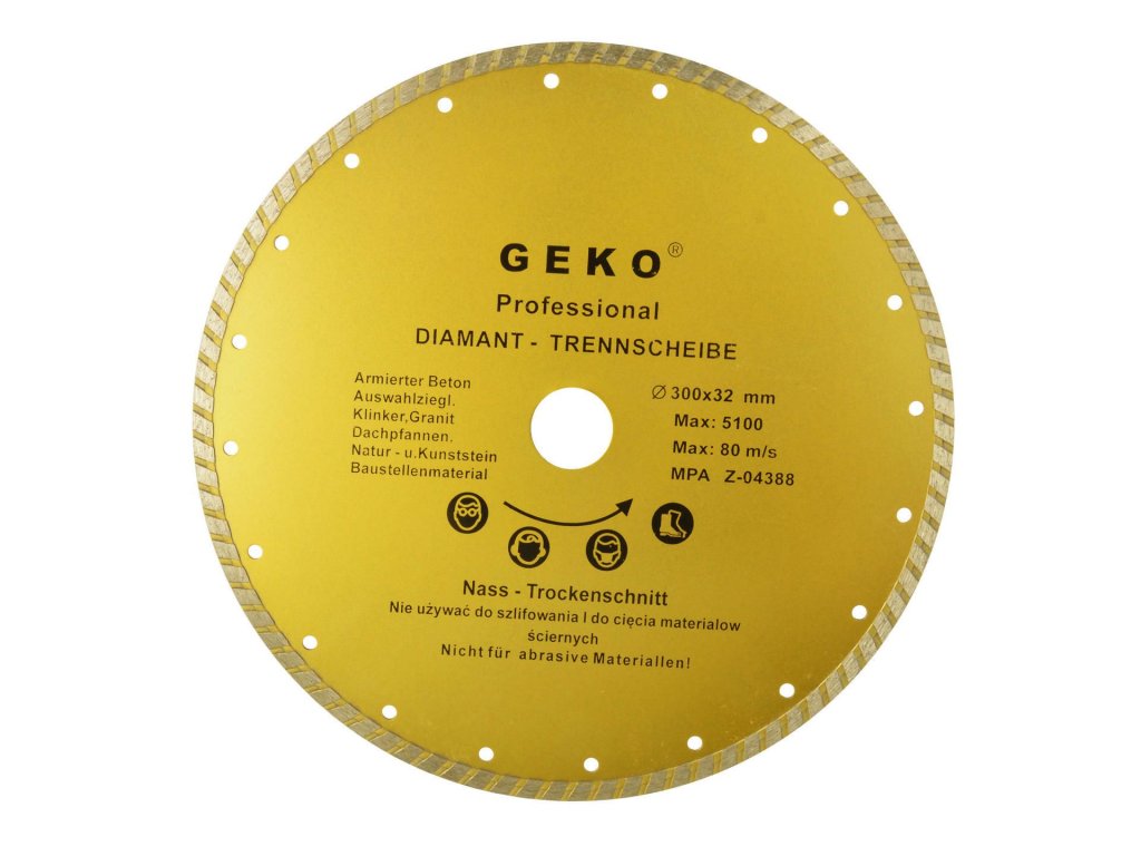 Precizní diamantový řezný kotouč GEKO s nepřerušovaným diamantovým segmentem a prolamováním po celém obvodu. Díky prolamování turbo kotouč chladí lépe jak obyčejný celoobvodový, lépe vynáší obroušený materiál z řezu ven a řezání je rychlejší, avšak může docházet ke štípání hran a výsledný řez je širší. Turbo kotouč se hodí pro hluboké řezání tvrdých stavebních materiálů jako je např. beton, zdivo, kámen, zámkový dlažba apod. S turbo kotoučem je možné řezat za mokra i za sucha.Technické parametry: