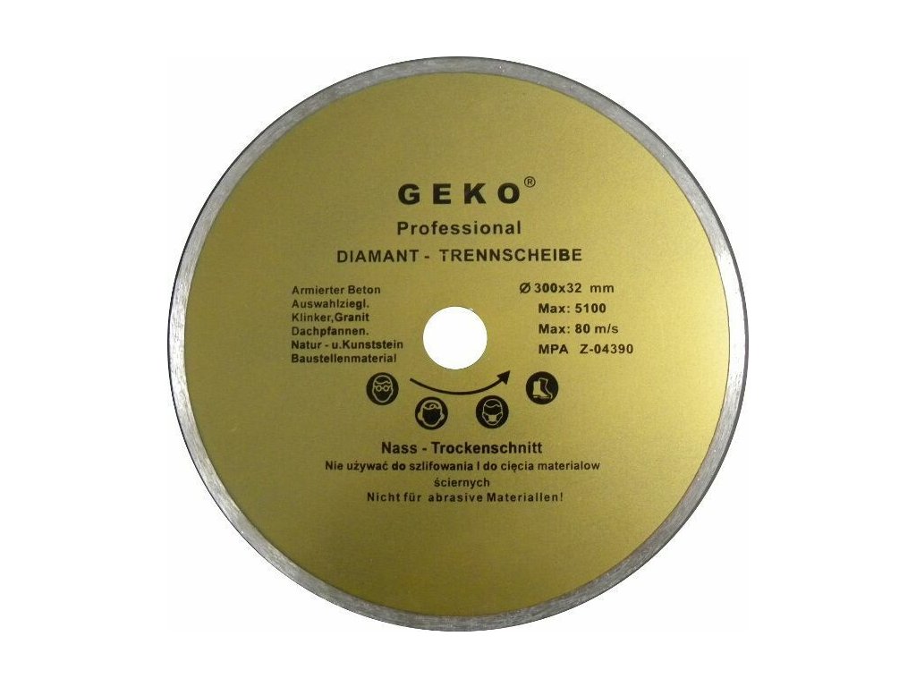 Precizní diamantový řezný kotouč GEKO s nepřerušeným diamantovým segmentem po celém obvodu. Tento kotouč je vhodný pro řezání tenkých tvrdých stavebních materiálů jako je např. keramika, glazované obklady nebo sklo a vytváří hladký a čistý řez bez otřepků. S celoobvodovým kotoučem je nutné řezat za mokra, aby nedošlo k přehřátí kotouče a jeho zvlnění.Technické parametry: