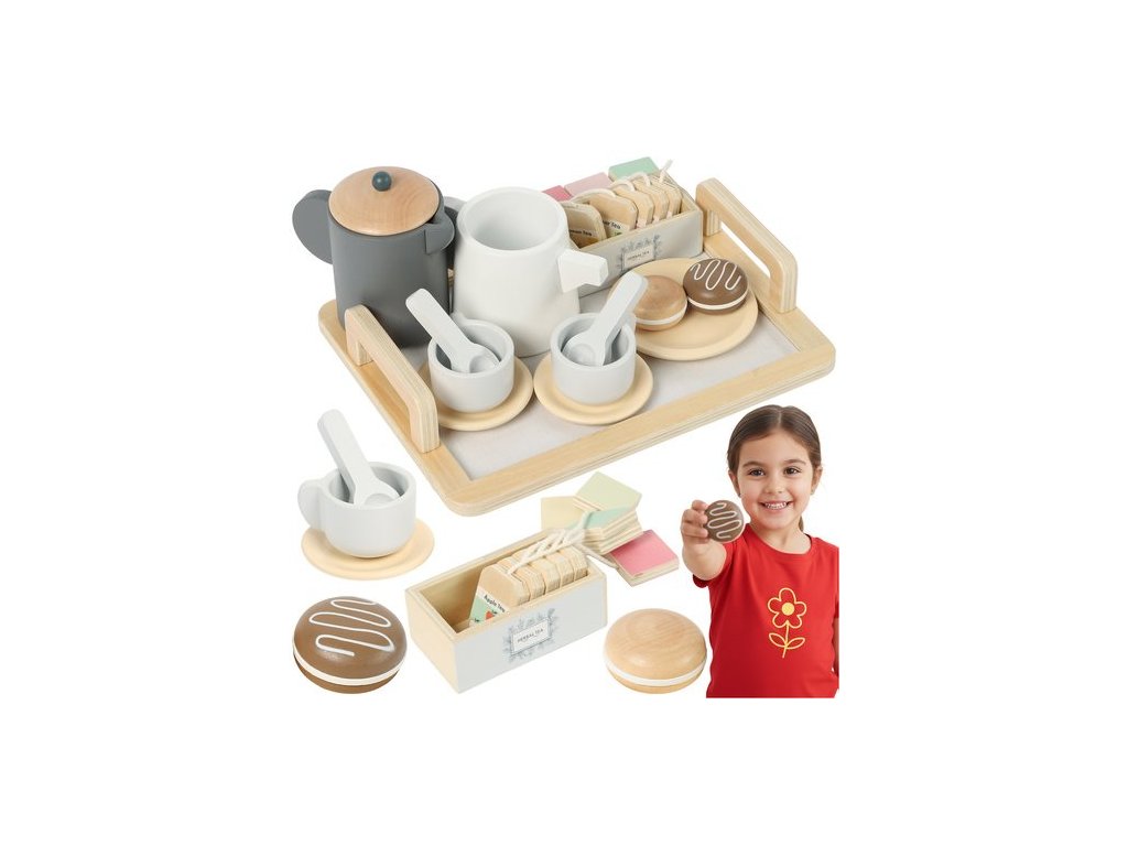 Drevená čajová súprava Kruzzel-detská kuchynská sada-tácka, kanvica, hrnčeky, lyžičky, makrónky-hracie doplnky-bezpečné drevo-perfektný darček