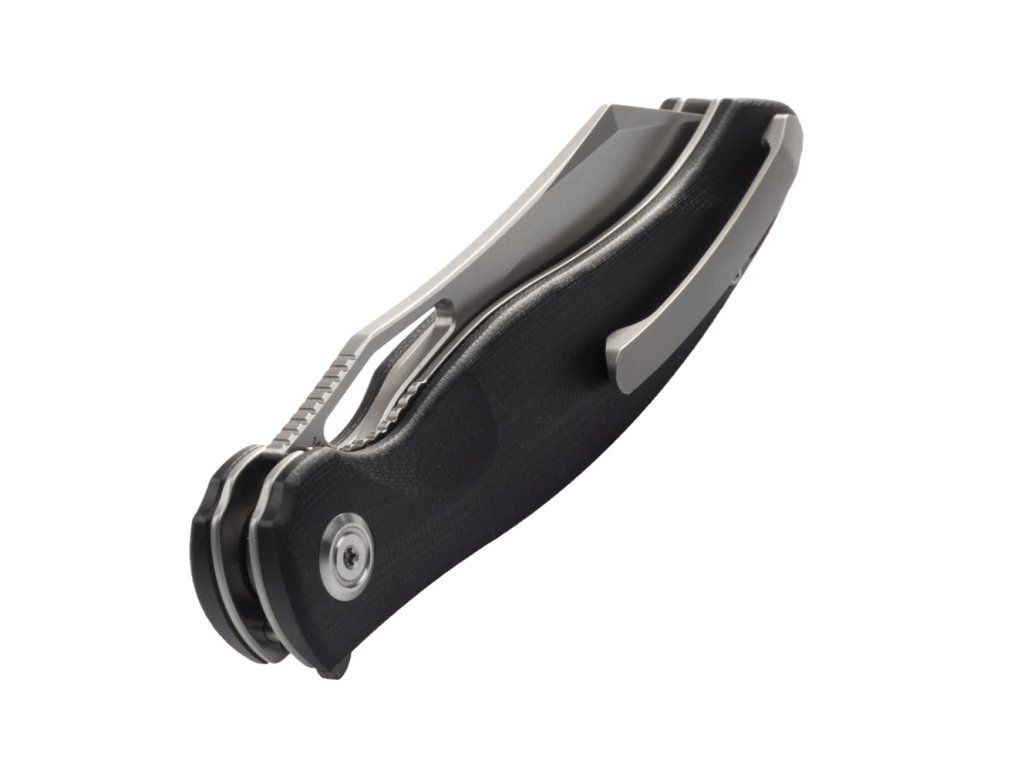 Elegantne tvarovaná rukoväť je vyrobená z odolného materiálu G10 čiernej farby. Na konci rukoväte sa nachádza otvor na šnúrku. Nôž je vybavený klipom na nosenie vo vrecku.