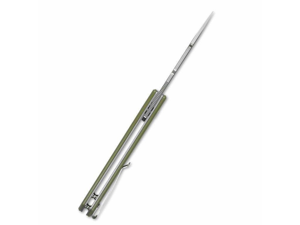 S odolnou rukoväťou z materiálu G10 zelenej farby, s pohodlným úchopom, dierkou na šnúrku a sponou na vrecká.