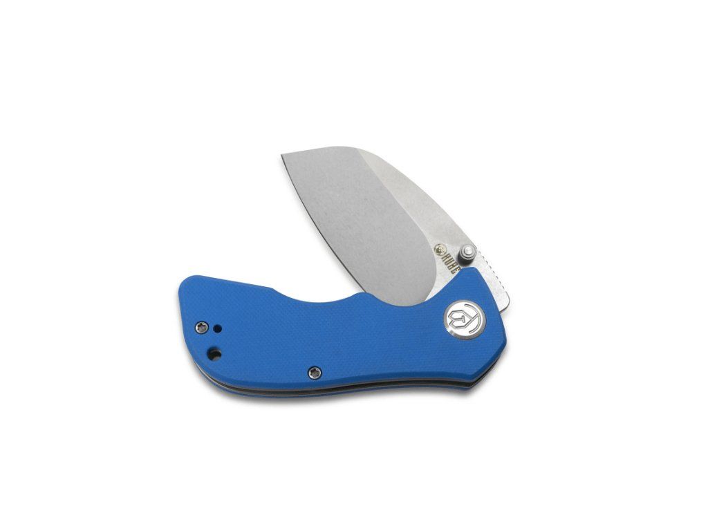 Rukoväť je vyrobená z odolného nekĺzavého G10 modrej farby, s textúrou pre lepšie uchopenie. S dierkou na šnúrku a sponou na vrecká.