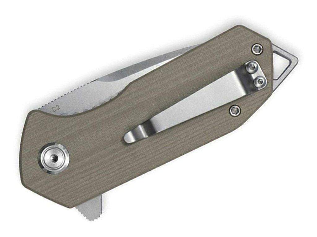 Rukoväť je vyrobená z odolného materiálu G10 hnedej kaki farby, s dierkou na šnúrku a sponou na vrecká.