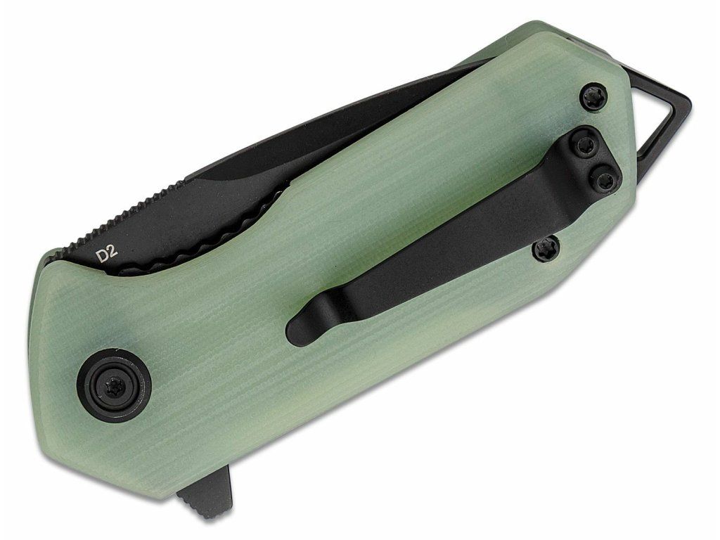 Rukoväť je vyrobená z odolného materiálu G10 bledozelenej Jade farby, s dierkou na šnúrku a sponou na vrecká.