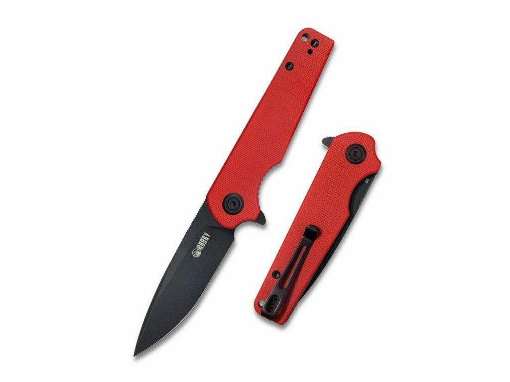 Tvarovaná rukoväť je vyrobená z odolného G10 červenej farby, s povrchom pre pohodlné uchopenie. S otvorom na šnúrku a sponou na vrecká.