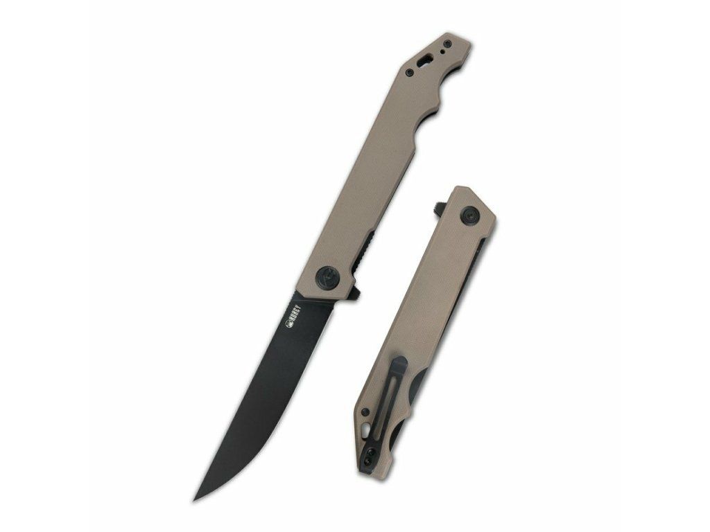 Štíhly zatvárací vreckový nôž Kubey KU253C Pylades Tan Black na univerzálne použitie, aj na krájanie potravín a na každodenné (EDC) nosenie.