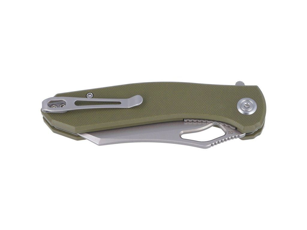 Rukoväť je vyrobená z odolného materiálu G10 zelenej farby, s textúrovaným povrchom pre pevné uchopenie. So sponou na vrecká.