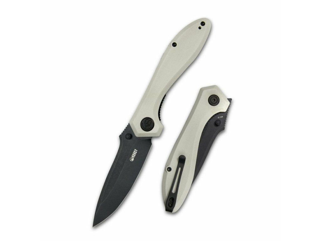 Tvarovaná rukoväť je z odolného materiálu G10 krémovej farby, so sponou na vrecká.