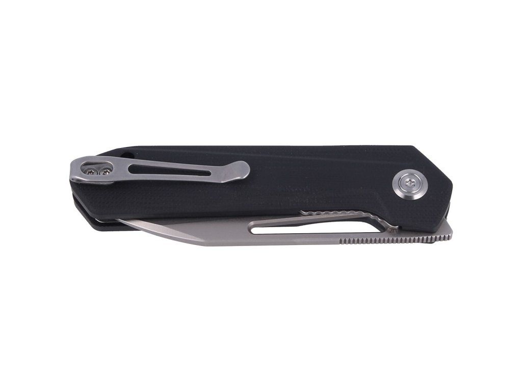 Rukoväť je vyrobená z odolného materiálu G10 čiernej farby s textúrou pre lepšiu priľnavosť. S dierkou na šnúrku a sponou na vrecká.