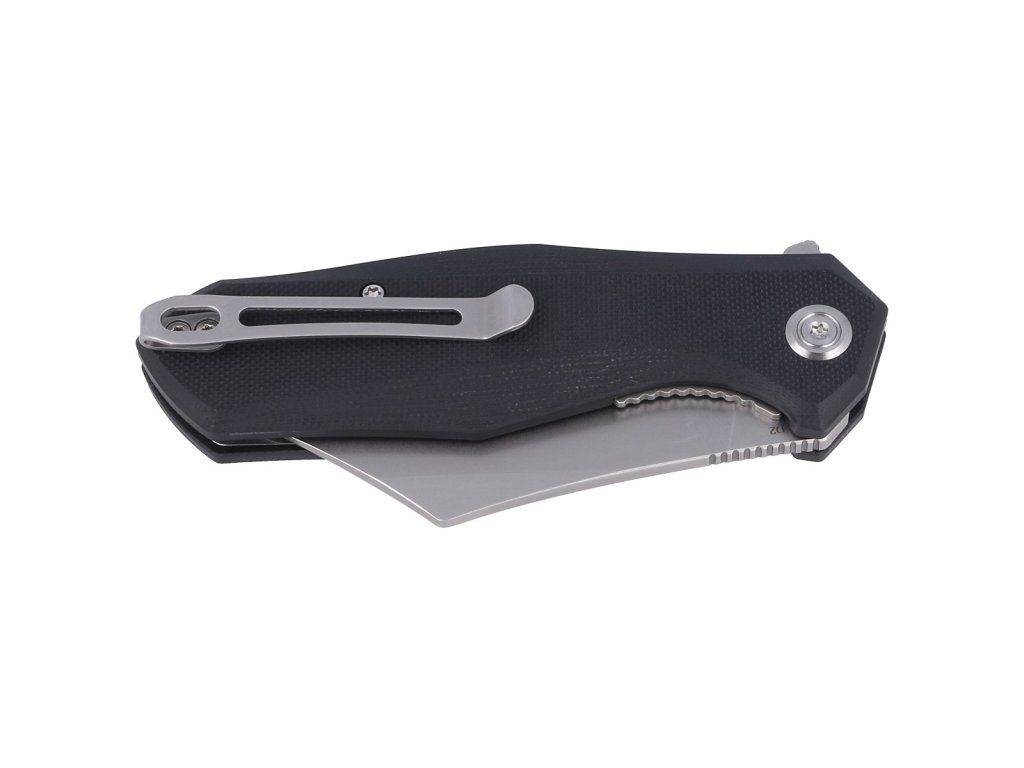 Rukoväť je z textúrovaného odolného materiálu G10 čiernej farby, s dvojpolohovou sponou na vrecká.
