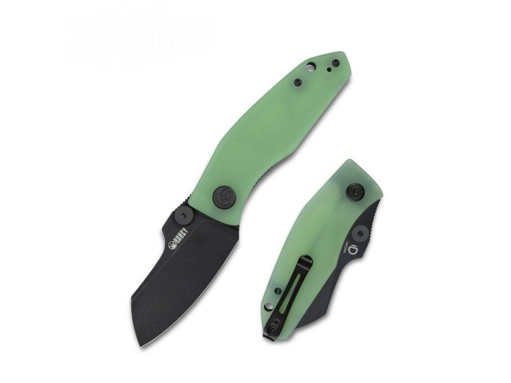Tvarovaná rukoväť je vyrobená z odolného G10 bledozelenej farby, s textúrovaným povrchom pre pohodlný úchop. S dierkou na šnúrku a sponou na vrecká.