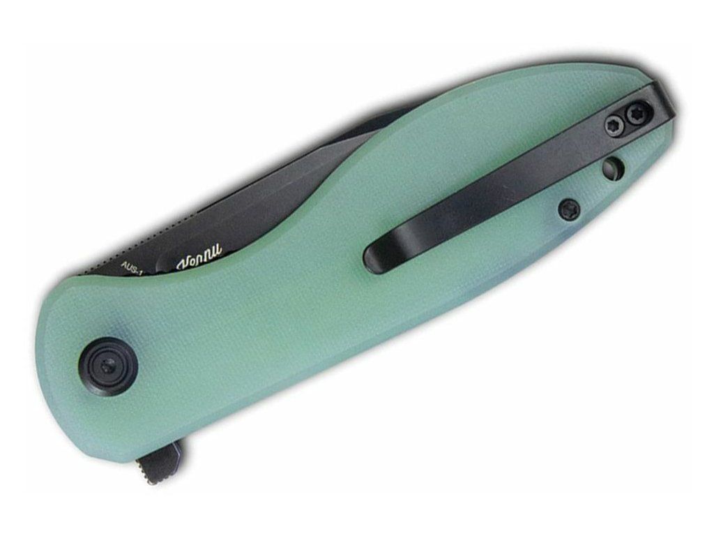 Rukoväť je vyrobená z odolného materiálu G10 zelenkavej farby Jade, so sponou na vrecká a dierkou na šnúrku.