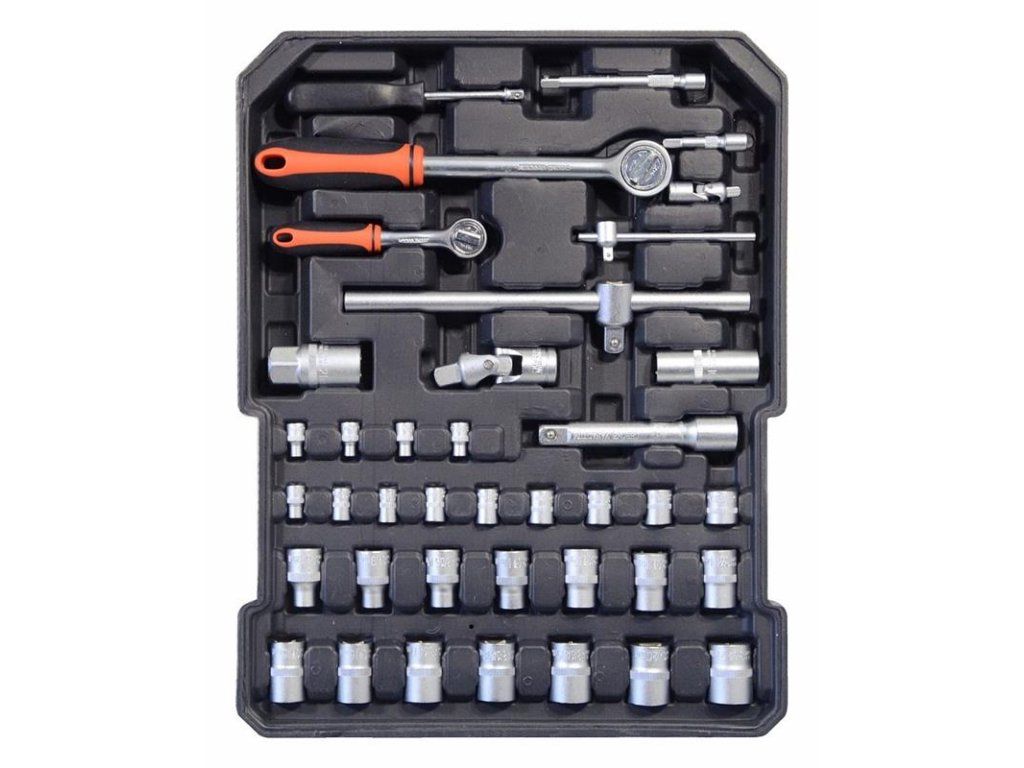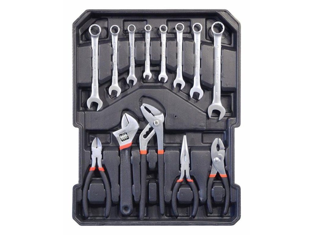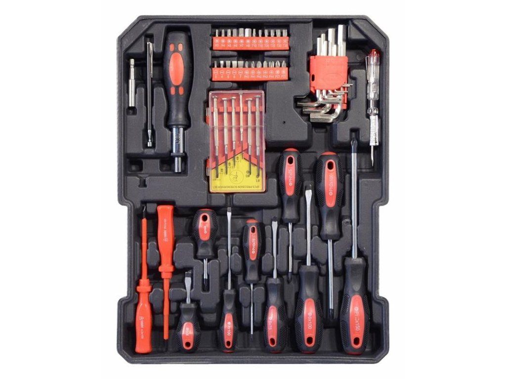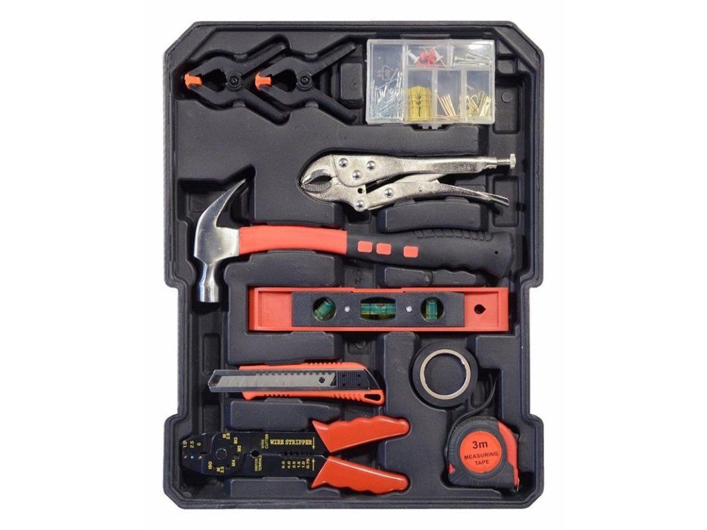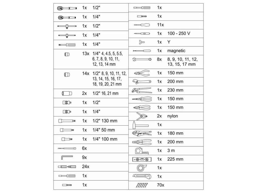 Súprava obsahuje rôzne kliešte, skrutkovače, nástrčné kľúče, kladivo, vodováhu, bočné a imbusové kľúče, bity, základný spojovací materiál a množstvo ďalšieho náradia, ktoré je vhodné na použitie doma, v garáži aj na cestách.