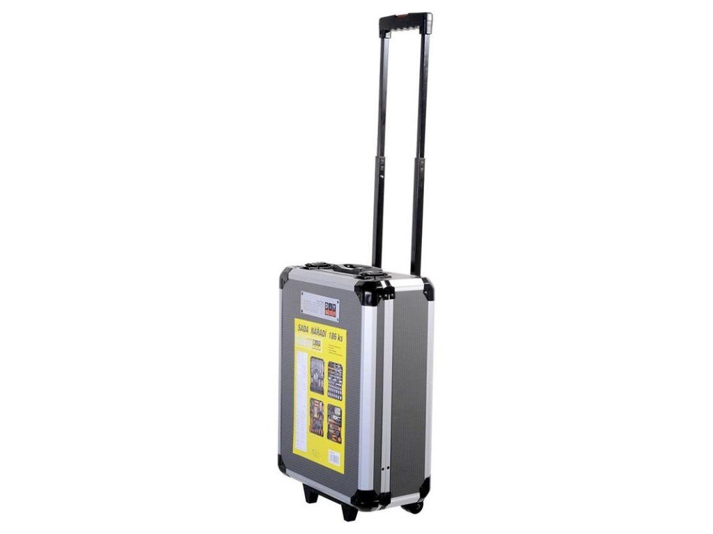 Praktický hliníkový kufor, 186 kvalitných dielov náradia, všetky usporiadané v prehľadných pozíciách - 4 zásobníky na náradie.