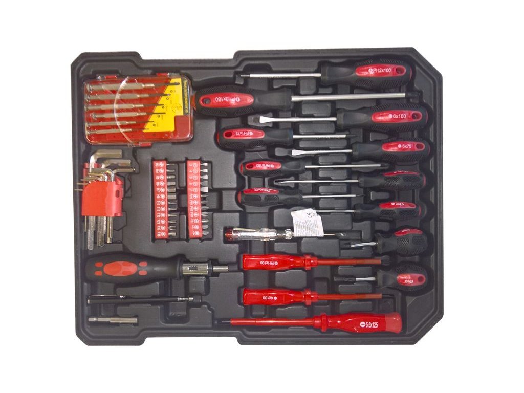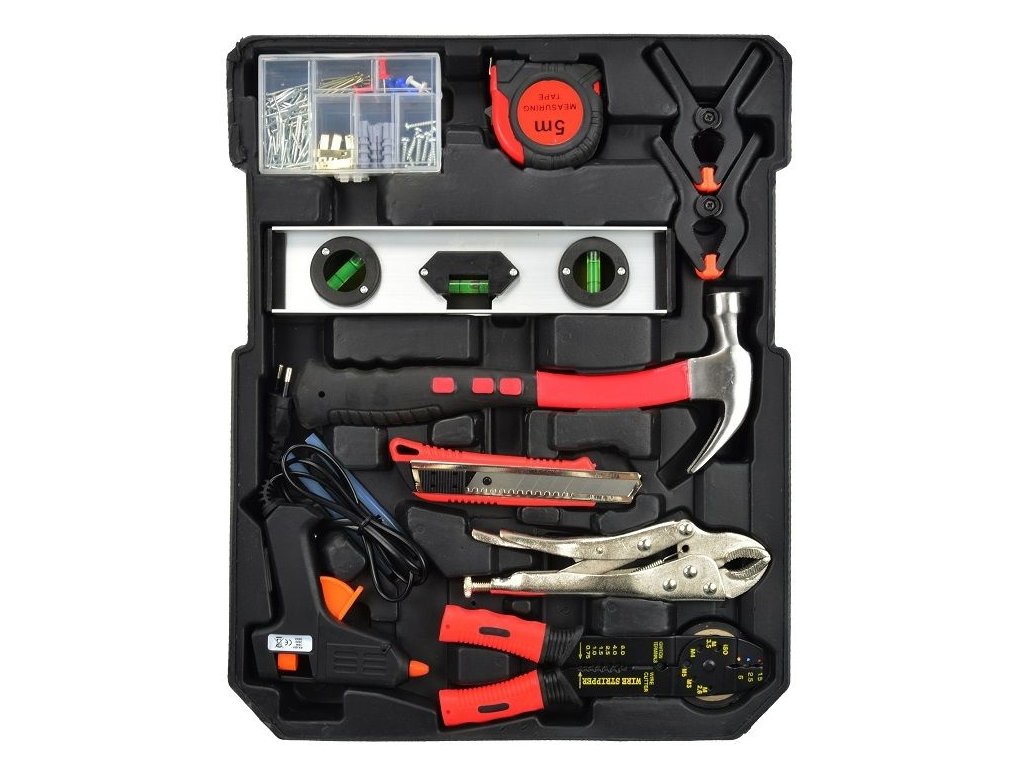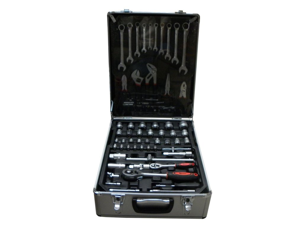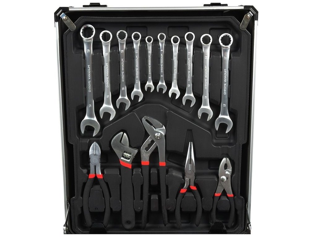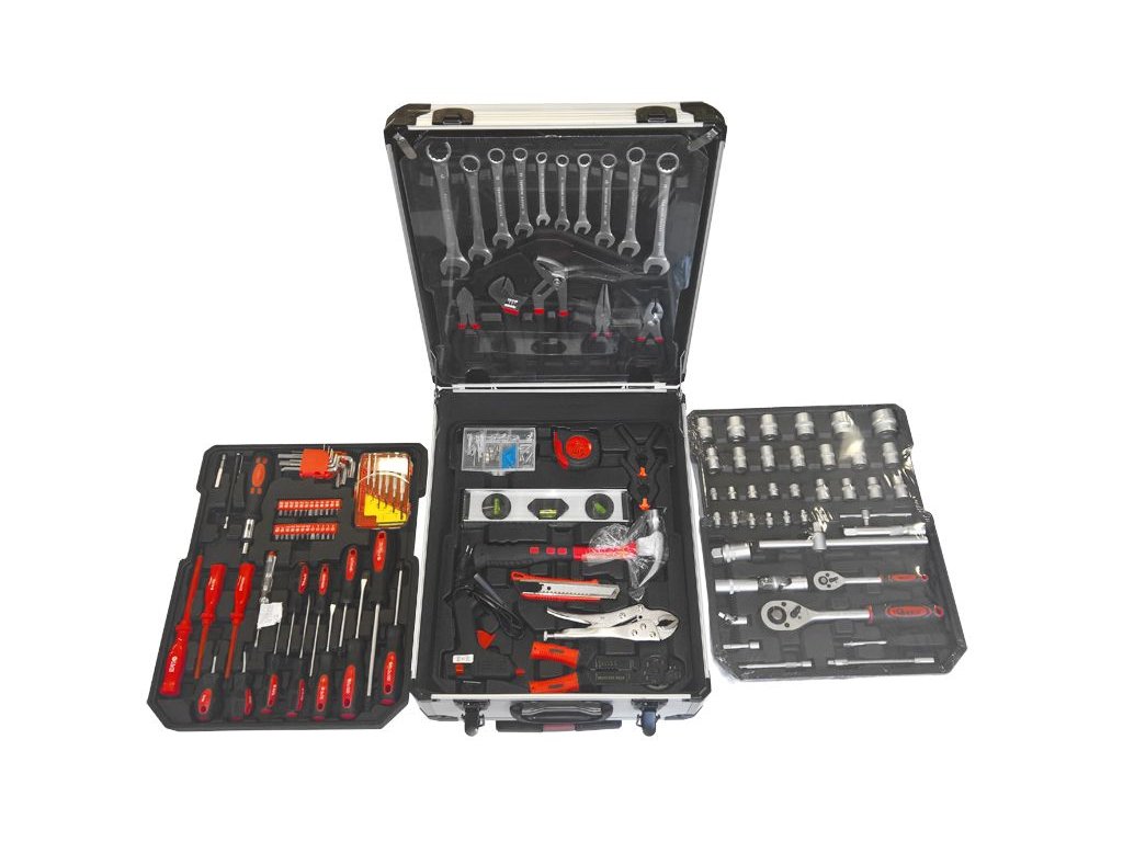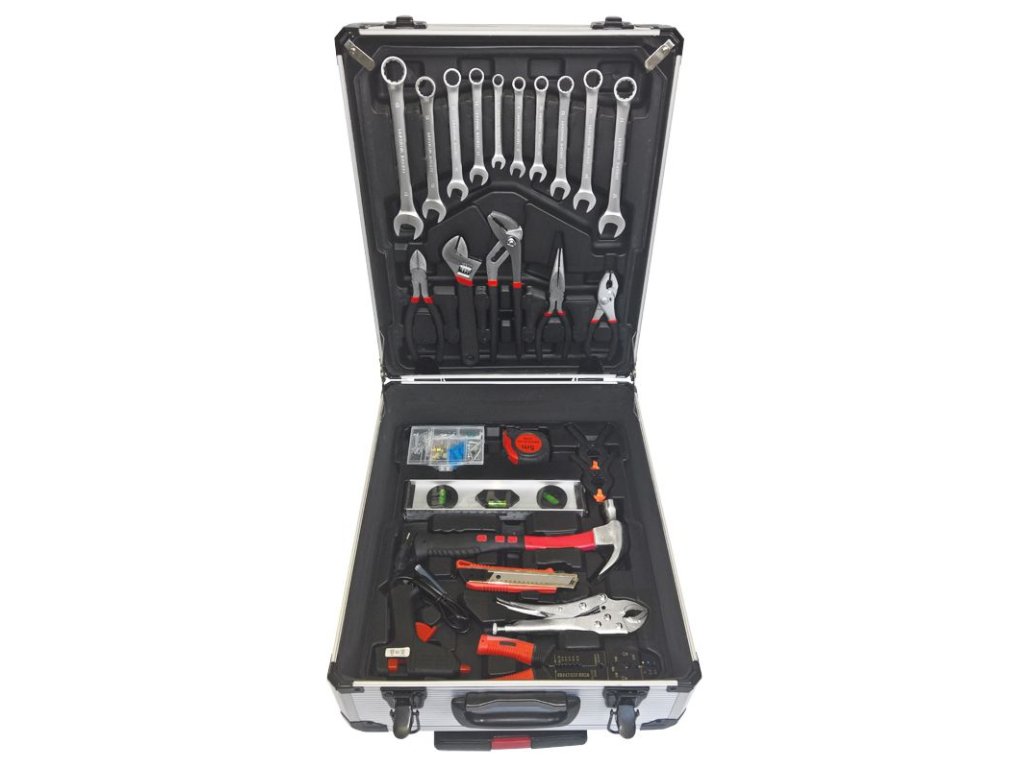 Praktický hliníkový kufr, 186 dílů kvalitního nářadí, vše uspořádané v přehledných pozicích - 4 nástrojová plata. Kufřík je vybaven teleskopickým úchytem a kolečky, díky kterým je manipulace s celou sadou nářadí velice snadná.Sada obsahuje celou řadu kleští, šroubováků, gola klíčů, kladivo, vodováhu, stranové i imbus klíče, bity, základní spojovací materiál a celou řadu dalšího nářadí, které je vhodné pro použití jak doma, v garáži, tak i na cestách.
