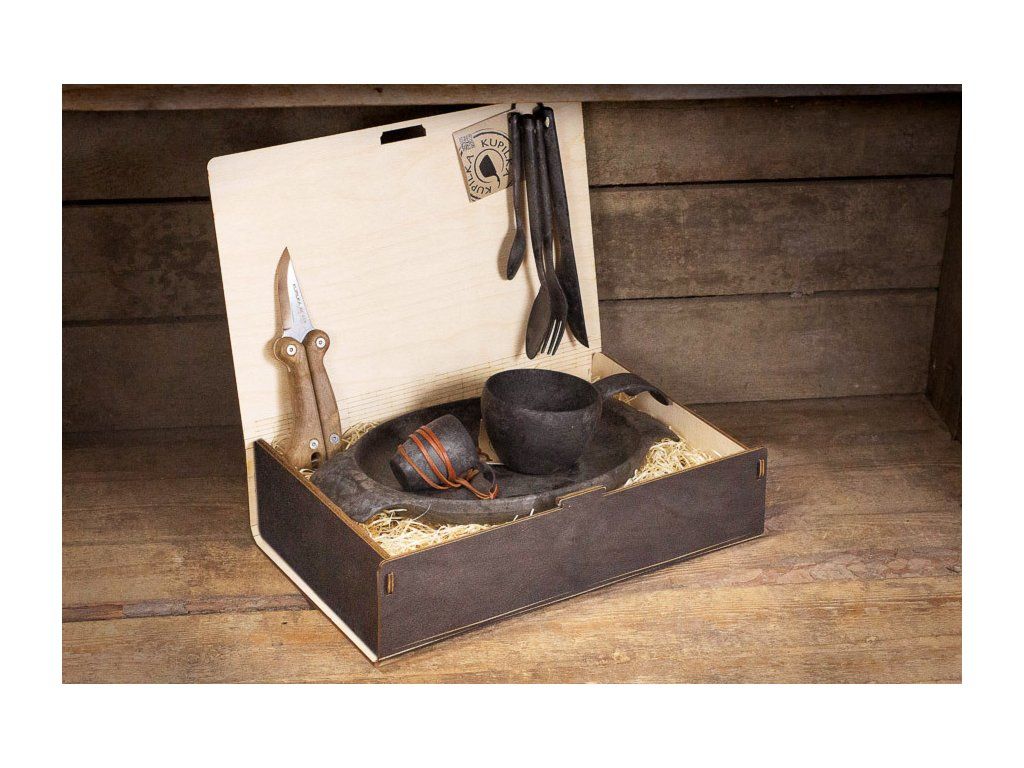 Kupilka KPLK Platinum Black súprava (nôž, pohárik, kuksa, tanier, príbor), čierna, drevená krabička