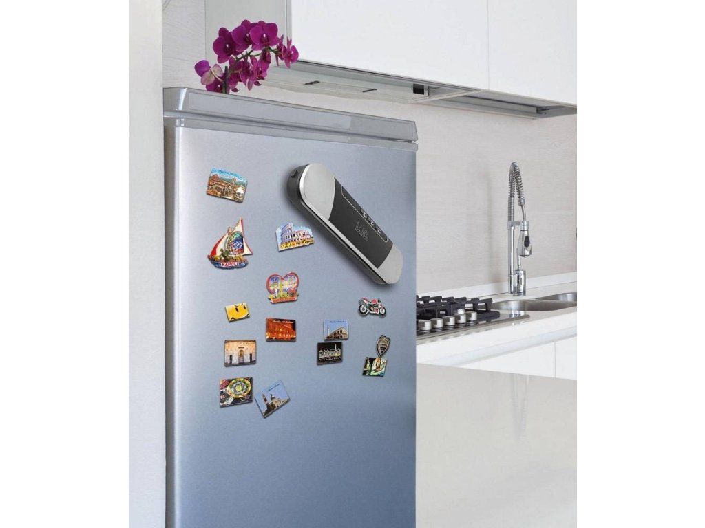 - Magnety v spodnej časti prístroja slúžiace na upevnenie ku kovovým povrchom napr. na chladničku