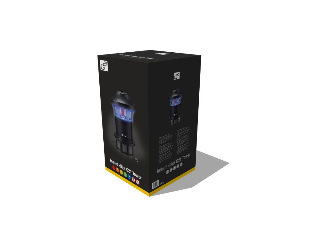 Lapač hmyzu G21 Tower s dosahom až 300 m2 obsahuje úspornú UV-A lampu, trubicu s reflektorom, výkonný sací vetrák, poistku proti úniku zachyteného hmyzu a zberný box.