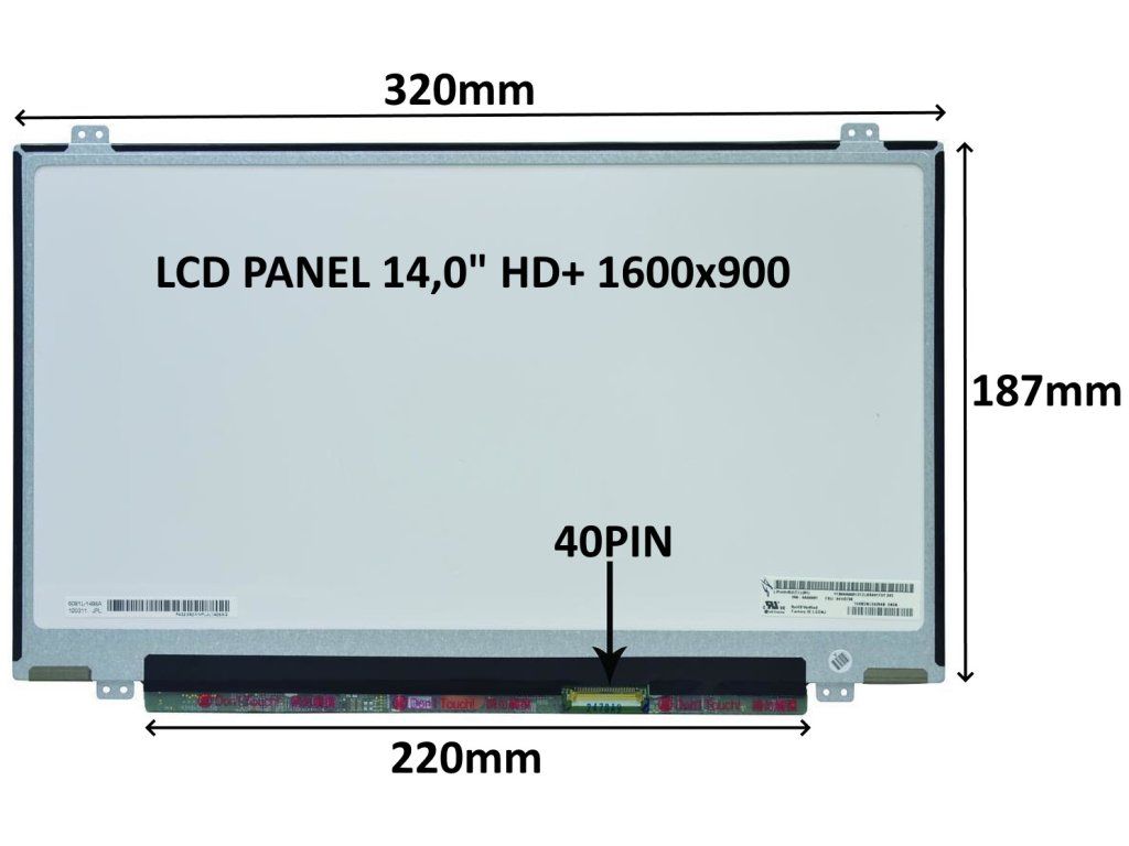 Náhradní díl LCD panel 14,0'' HD+ 1600x900 v matném provedení.Úhlopříčka: 14,0'' Rozlišení: 1600x900 HD+ Konektor: 40 PIN Typ podsvícení: LED Povrch LCD panelu: MATNÝ Technologie LCD panelu: TN Rozměry: Šířka: 320 mm Výška: 187 mm Délka invertoru: 220 mm Způsob uchycení LCD panelu: úchyty nahoře a dole Záruka: 24 měsíců i na vadné pixely