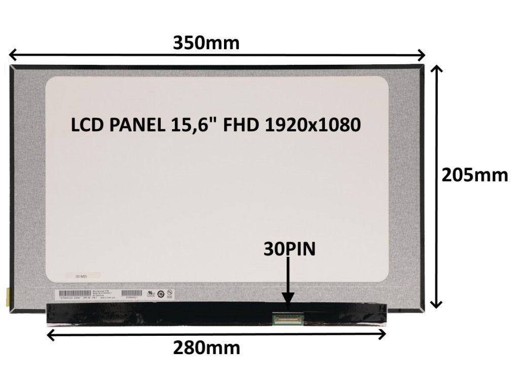Náhradní díl LCD panel 15,6'' FHD 1920x1080 IPS v matném provedení.Úhlopříčka: 15,6'' Rozlišení: 1920x1080 FHD Konektor: 30 PIN Typ podsvícení: LED Povrch LCD panelu: MATNÝ Technologie LCD panelu: IPS Rozměry: Šířka: 350 mm Výška: 205 mm Délka invertoru: 280 mm Způsob uchycení LCD panelu: bez úchytů - lepení k LCD krytu Záruka: 24 měsíců i na vadné pixely