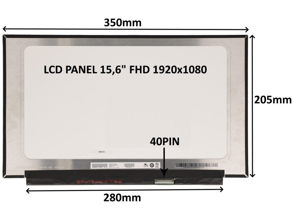 Náhradní díl LCD panel 15,6'' FHD 1920x1080 IPS 120Hz v matném provedení.Úhlopříčka: 15,6'' Rozlišení: 1920x1080 FHD Konektor: 40 PIN Typ podsvícení: LED Povrch LCD panelu: MATNÝ Technologie LCD panelu: IPS Rozměry: Šířka: 350 mm Výška: 205 mm Délka invertoru: 280 mm Způsob uchycení LCD panelu: bez úchytů - lepení k LCD krytu Záruka: 24 měsíců i na vadné pixely