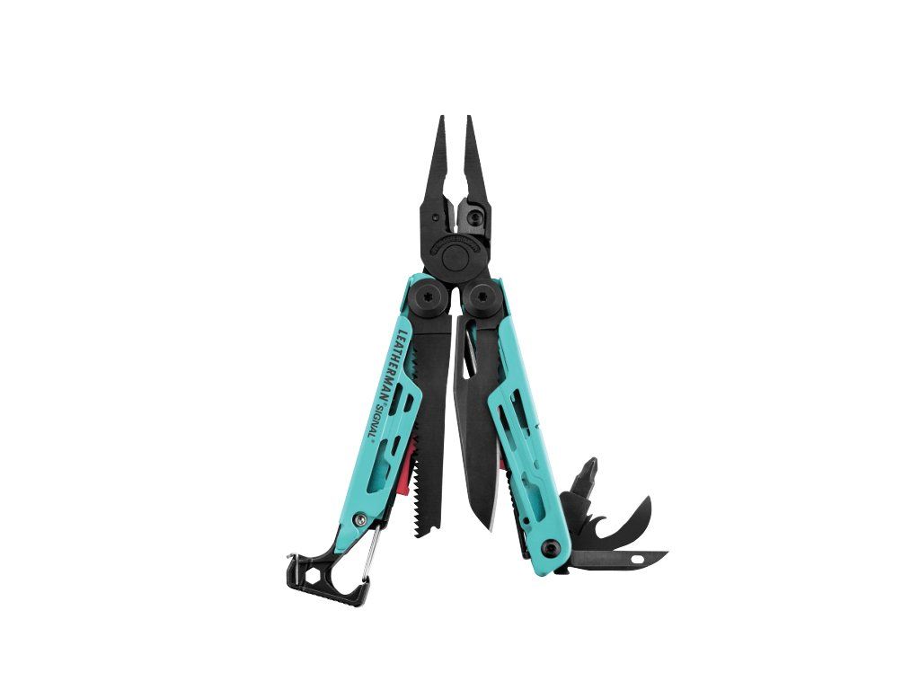 Multifunkčný nástroj v modrom prevedení Leatherman SIGNAL AQUA BLUE so zakomponovanými 19 nástrojmi, s telom z nehrdzavejúcej ocele v kombinácií DLC povlakom s vysokým obsahom uhlíka.