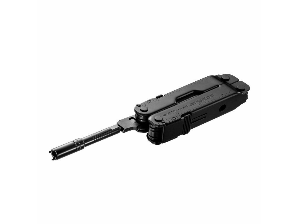 Multifunkčný nástroj - kliešte Leatherman Super Tool 300M Black v čiernej farbe, obsahuje tradičné nástroje + 2 špeciálne pre vojakov, strelcov či policajtov t.j. škrabku karbónu a adaptér na kefku pre čistenie zbraní.