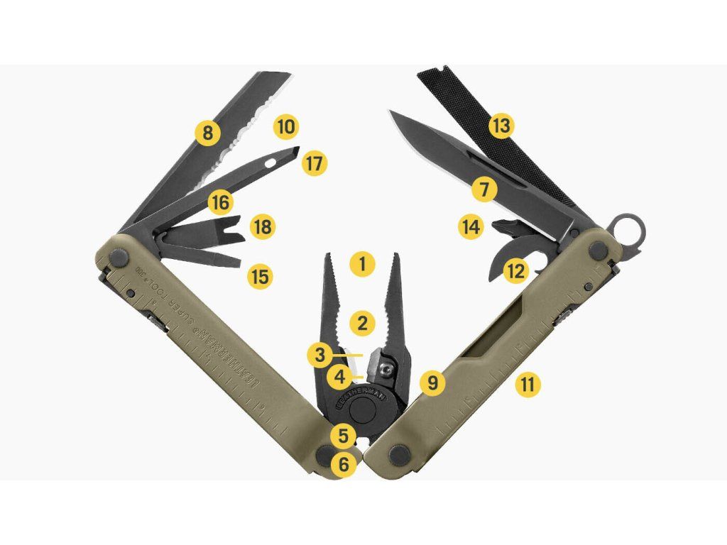 Ukrýva vo svojom tele 18 praktických funkcií, všetky vybavené poistkou proti náhodnému zatvoreniu. S krúžkom na karabínu, ktorou ho možno pripnúť na batoh či opasok.