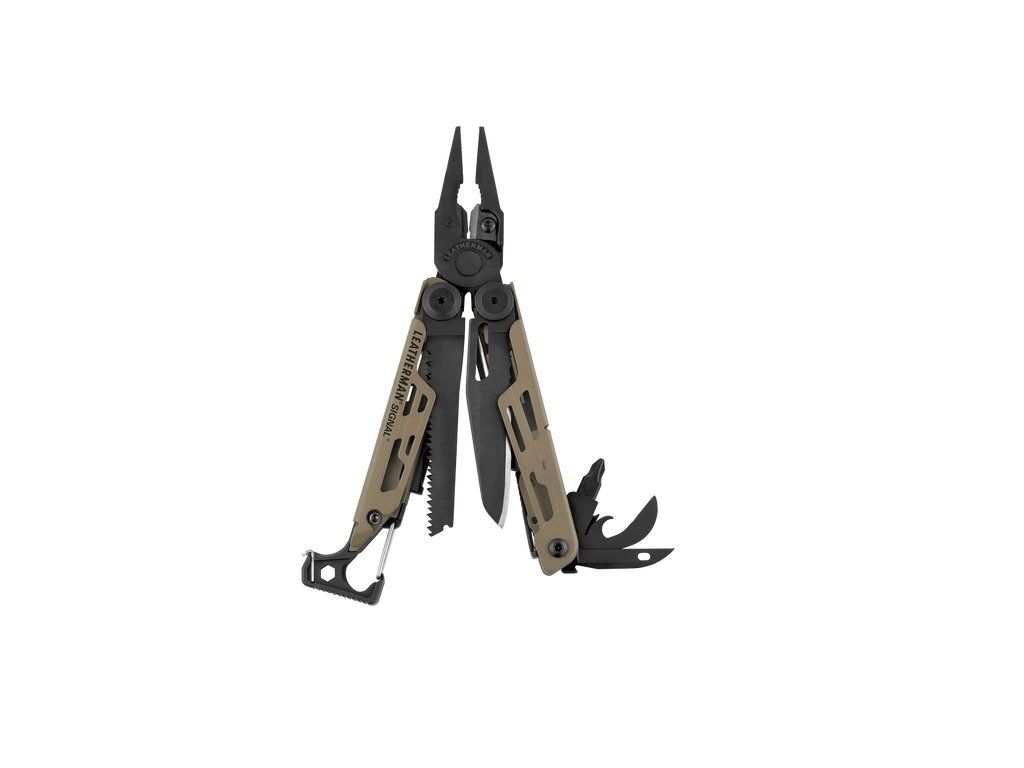 Multifunkčný nástroj v hnedo-striebornom prevedení Leatherman SIGNAL Coyote Tan so zakomponovanými 19 nástrojmi, s telom z nehrdzavejúcej ocele v kombinácií DLC povlakom s vysokým obsahom uhlíka.