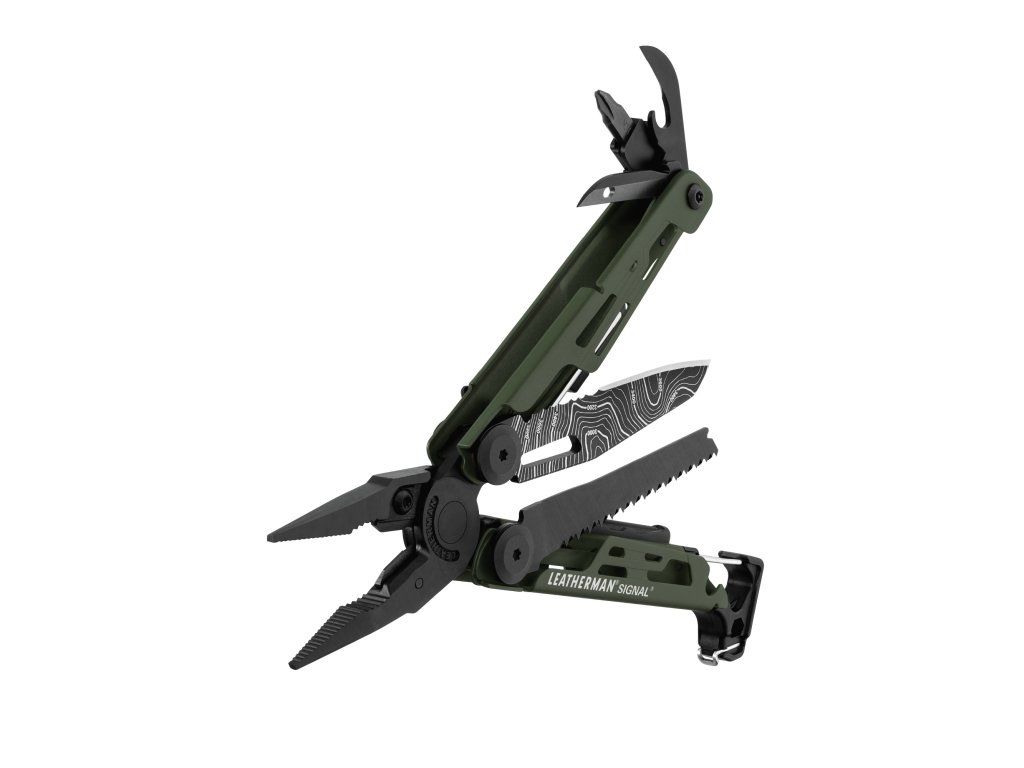 Multifunkčný nástroj v čierno-zelenom prevedení Leatherman SIGNAL GREEN TOPO so zakomponovanými 19 nástrojmi, s čepeľou s vrstevnicami.