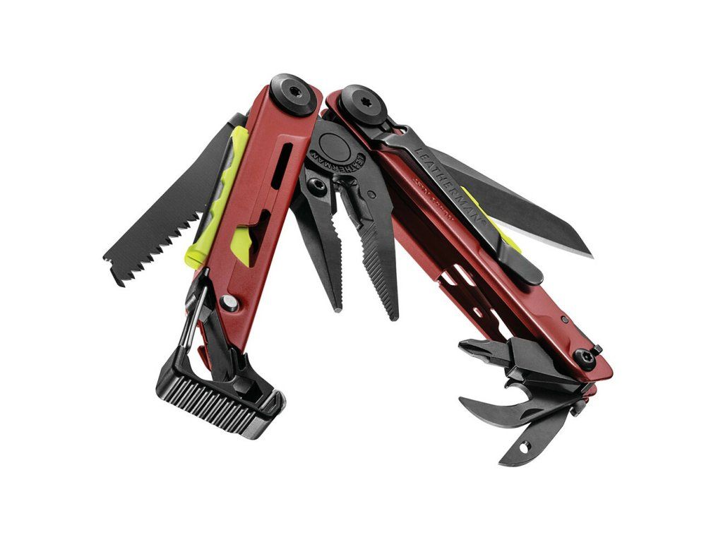 Multifunkčný nástroj v čierno-bordovom prevedení Leatherman SIGNAL CRIMSON so zakomponovanými 19 nástrojmi, s telom z nehrdzavejúcej ocele v kombinácií DLC povlakom s vysokým obsahom uhlíka.