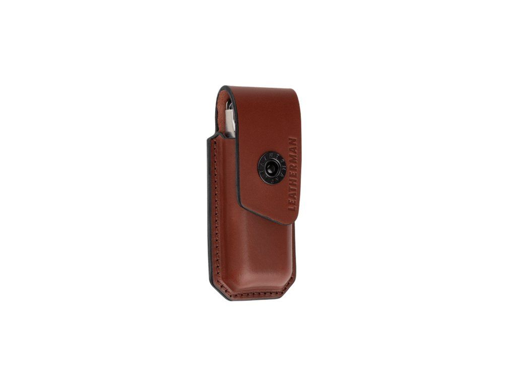 Veľké hnedé puzdro Leatherman Sheath Premium L z kvalitnej hovädzej kože, ktoré poskytuje dlhodobú ochranu pre multifunkčné nástroje. Zaistené kvalitným uzáverom. Možno ho pripevniť k opasku (max šírka opasku 4,42 cm).