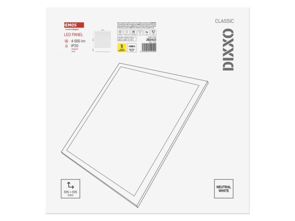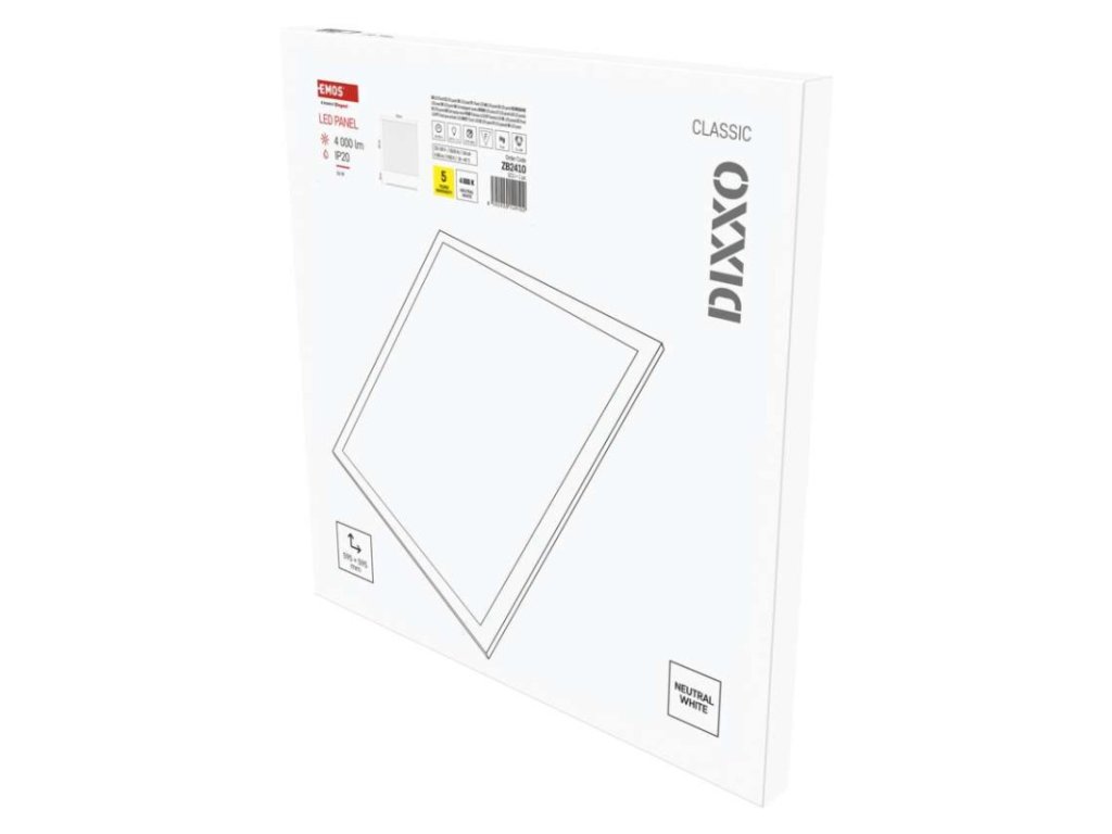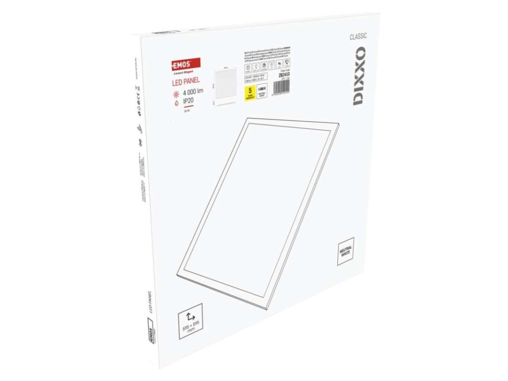 ďalšie funkcie: –|diaľkový ovládač: nie|do chodby a na schodisko: nie|do dielne a garáže: nie|do kancelárie: áno|do kuchyne: nie|do kúpeľne: nie|do obývačky, spálne a detskej izby: nie|dosah senzora: –|do záhrady a na balkón: nie|farba svetla: neutrálna biela|farba tela: biela|flicker-free: áno|frekvencia: 50/60 Hz|index podania farieb (CRI): Ra > 80|jazyky aplikácie: –|kategória: CLASSIC|kompatibilita: –|krytie: IP20|materiál difúzora: plast (PS)|materiál LGP: –|materiál tela: oceľový plech|montážny otvor: –|možnosť stmievania: nie|náhrada za žiarovku: 4× 18 W CFL|napätie: 220–240 V|notifikácie do mobilnej aplikácie: nie|obsah balenia: –|ovládanie hlasovými asistentmi: nie|podporované OS: –|pohybový senzor: nie|predajný obal: 1 ks, krabica|prenosová frekvencia: –|príkon: 36 W|protokol: –|prúd: 160 mA|rada: DIXXO|rozmer: 595 × 595 × 28 mm|spôsob montáže: vstavané|svetelná účinnosť: 110 lm/W|svetelný tok: 4 000 lm|teplota chromatičnosti: 4 000 K|tvar: štvorec|typ difúzora: mliečny|typ svietidla: panel|účinník: > 0,9|UGR<: 22|uhol vyžarovania: 120°|umiestnenie: stropné|výstupný prúd zo zdroja: 900 mA|záručná doba: 5 rokov|zdroj svetla: LED|životnosť: 50 000 hodínDodatočné parametre