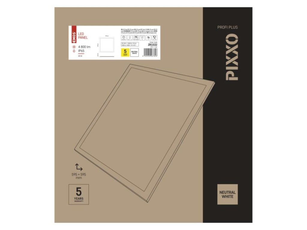 diaľkový ovládač: nie|do chodby a na schodisko: nie|do dielne a garáže: nie|do kancelárie: áno|do kuchyne: nie|do kúpeľne: nie|do obývačky, spálne a detskej izby: nie|dosah senzora: nemá senzor|do záhrady a na balkón: nie|farba svetla: neutrálna biela|farba tela: biela|flicker-free: áno|frekvencia: 50/60 Hz|index podania farieb (CRI): Ra > 80|kategória: PROFI PLUS|kompatibilita: –|krytie: IP65|materiál difúzora: plast (PC)|materiál LGP: PMMA|materiál tela: hliník|montážny otvor: neuvádza sa|možnosť stmievania: nie|náhrada za žiarovku: 4× 18 W CFL|napätie: 220–240 V|notifikácie do mobilnej aplikácie: #|obsah balenia: –|ovládanie hlasovými asistentmi: #|podporované OS: –|pohybový senzor: nie|predajný obal: 1 ks, krabica|prenosová frekvencia: –|príkon: 48 W|protokol: –|prúd: 160 mA|rada: PROXO|rozmer: 595 × 595 × 10 mm|spôsob montáže: vstavané|svetelná účinnosť: 100 lm/W|svetelný tok: 4 800 lm|teplota chromatičnosti: 4 000 K|tvar: štvorec|typ difúzora: mliečny|typ svietidla: panel|účinník: > 0,9|UGR<: 22|uhol vyžarovania: 120°|umiestnenie: stropné|výstupný prúd zo zdroja: 1 200 mA|záručná doba: 5 rokov|zdroj svetla: LED|životnosť: 40 000 hodínDodatočné parametre
