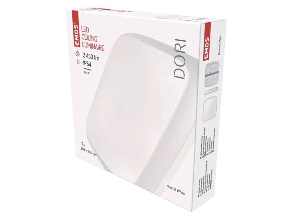 diaľkový ovládač: nie|do chodby a na schodisko: áno|do dielne a garáže: áno|do kancelárie: nie|do kuchyne: áno|do kúpeľne: áno|do obývačky, spálne a detskej izby: nie|dosah senzora: nemá senzor|do záhrady a na balkón: áno|farba svetla: neutrálna biela|farba tela: biela|flicker-free: áno|frekvencia: 50/60 Hz|index podania farieb (CRI): Ra > 80|kategória: CLASSIC|krytie: IP54|materiál difúzora: plast (PC)|materiál LGP: neuvádza sa|materiál tela: plast (PC)|montážny otvor: neuvádza sa|možnosť stmievania: nie|náhrada za žiarovku: 150 W|napätie: 220–240 V|pohybový senzor: nie|predajný obal: 1 ks, krabica|príkon: 24,5 W|prúd: 180 mA|rada: DORI|rozmer: 280 × 280 × 55 mm|spôsob montáže: prisadené|svetelná účinnosť: 85 lm/W|svetelný tok: 2 450 lm|teplota chromatičnosti: 4 000 K|tvar: štvorec|typ difúzora: mliečny|typ svietidla: klasické svietidlo|účinník: > 0,5|UGR<: neuvádza sa|uhol vyžarovania: 115°|umiestnenie: stropné/nástenné|výstupný prúd zo zdroja: neuvádza sa|záručná doba: 2 roky|zdroj svetla: LED|životnosť: 25 000 hodínDodatočné parametre