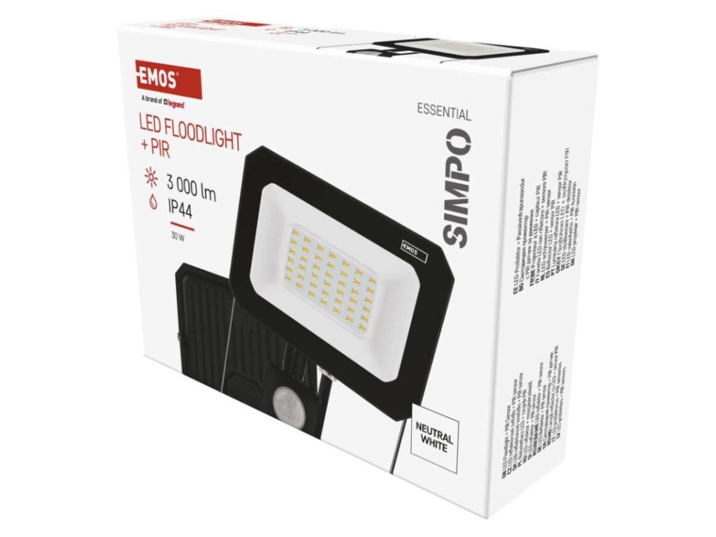 akumulátor: nie|dĺžka prívodného kábla: 20 cm|doba svietenia na AKU: neuvádza sa|dosah PIR senzora: 8 m|energetická trieda použitého zdroja svetla: –|farba: čierna|farba svetla: neutrálna biela|flicker-free: áno|frekvencia: 50/60 Hz|index podania farieb (CRI): Ra > 80|kategória: ESSENTIAL|krytie: IP44|materiál difúzora: sklo|materiál prívodného kábla: guma|materiál tela: hliník|napájanie: zo siete|napätie: 220–240 V~|PIR senzor: áno|počet priechodných zásuviek: neuvádza sa|použitie: závesná montáž|predajný obal: 1 ks, krabica|príkon: 30 W|prúd: 130 mA|rada: SIMPO|rozmer: 143 × 175 × 52 mm|rozsah pracovnej teploty: -20 °C až +40 °C|skúšobná žiarovka súčasťou balenia: nie|stmievanie: nie|stupeň ochrany proti mechanickým nárazom: neuvádza sa|svetelná účinnosť: 100 lm/W|svetelný tok: 3 000 lm|teplota chromatičnosti: 4 000 K|typ priechodných zásuviek: neuvádza sa|typ prívodného kábla: H05RN-F|typ stmievania: #|účinník: > 0,9|uhol vyžarovania: 120°|záručná doba: 2 roky|zdroj svetla: LED|životnosť: 25 000 hodínDodatočné parametre
