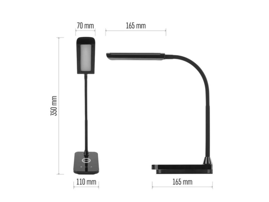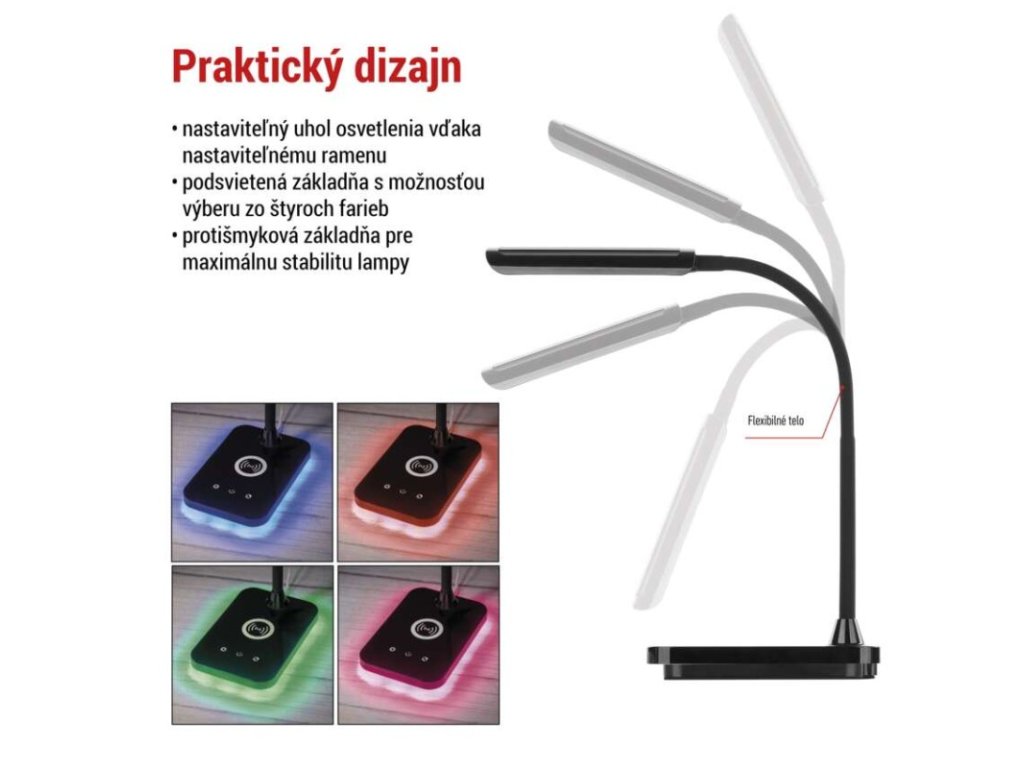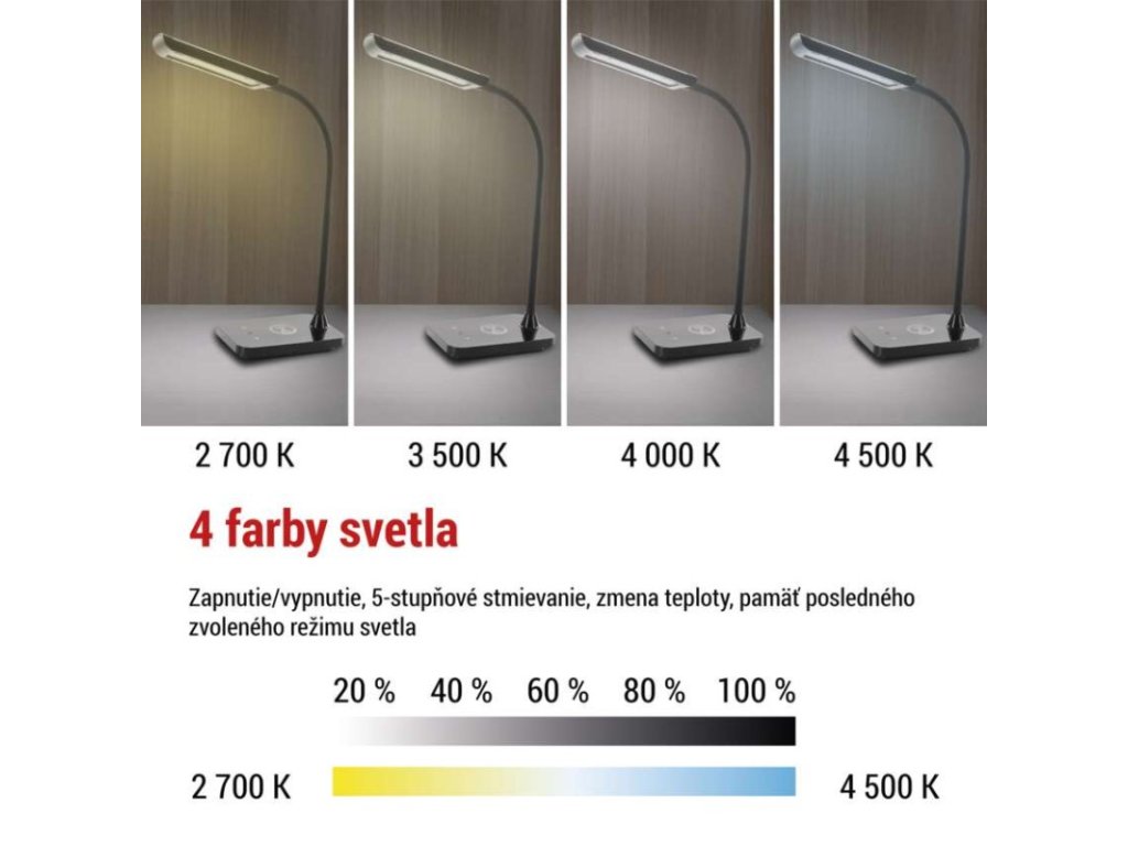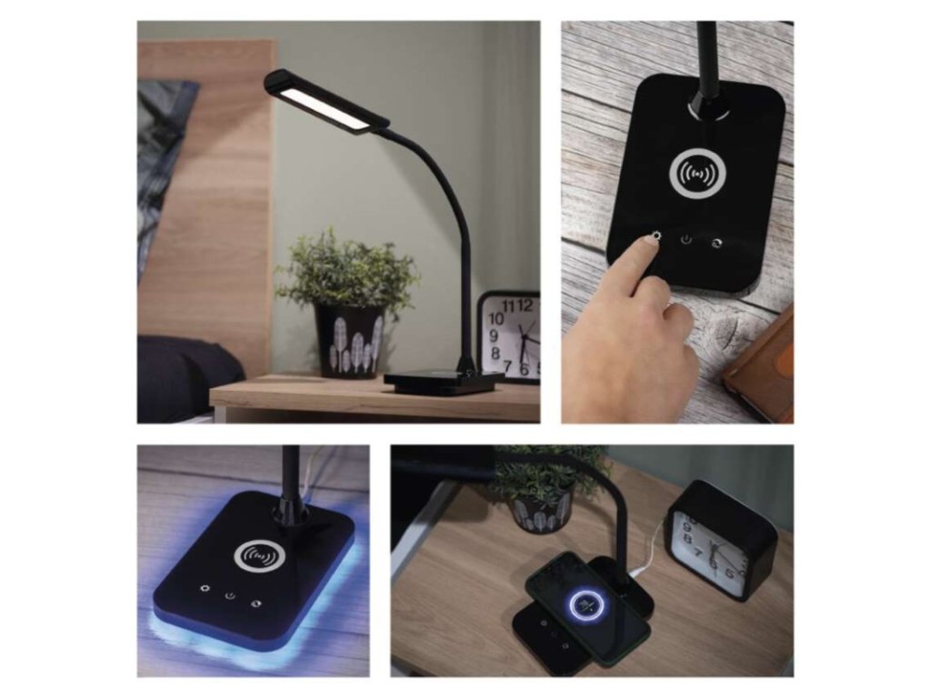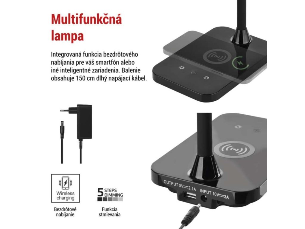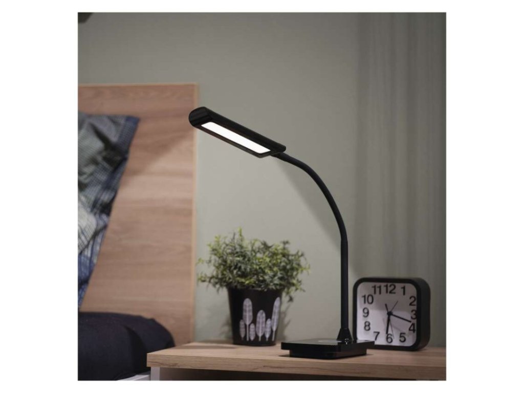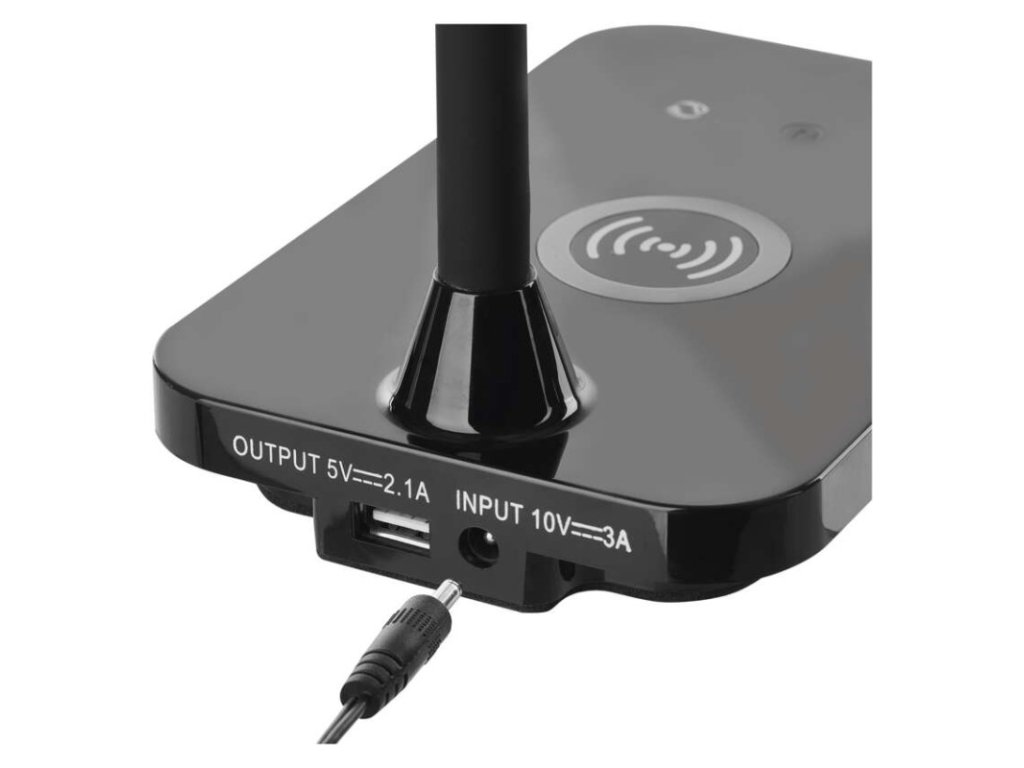 činiteľ starnutia: 0,96|čip LED: SMD|dĺžka prívodného kábla: 1,5 m|energetická trieda: neuvádza sa|energetická trieda (od 1.9.2021): neuvádza sa|farba: čierna|farba svetla: teplá/neutrálna/studená biela|index podania farieb (CRI): Ra > 90|integrovaná nabíjacia batéria: nie|krytie: IP20|materiál: ABS plast|max. výkon: 5,5 W|napájacie trafo: 10 V/3 000 mA|napájací zdroj súčasťou balenia: áno|napätie: 220–240 V|obsah ortuti: neuvádza sa|pätica (uchytenie žiarovky): neuvádza sa|počet LED: neuvádza sa|počet spínacích cyklov: neuvádza sa|predajný obal: 1 ks, krabica|príkon: 5,5 W|rozmer: 350 mm|rýchlosť nábehu na 100 %: neuvádza sa|stmievanie: áno|svetelný tok: 300 lm|teplota chromatičnosti: 2 700–4 500 K|typ napájania: sieť|účinník: neuvádza sa|USB port: áno + bezdrôtové nabíjanie|životnosť: neuvádza saDodatočné parametre