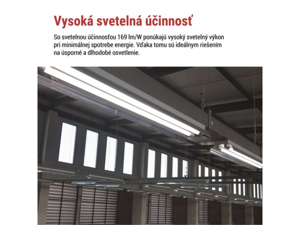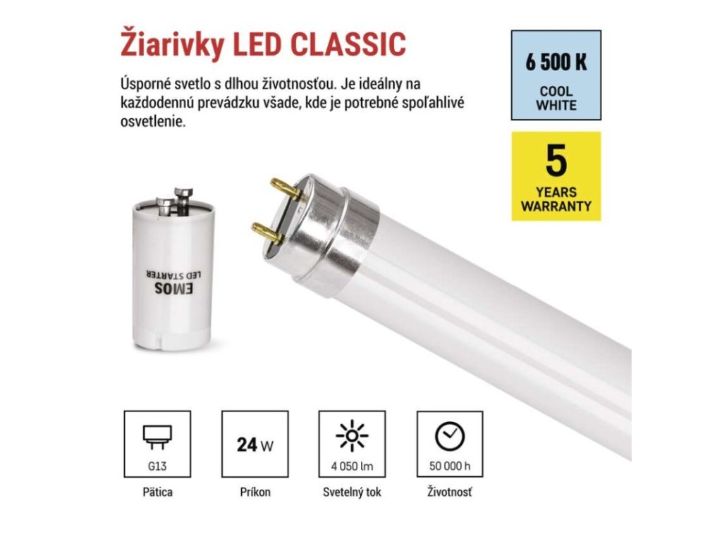 energetická trieda: C|farba svetla: studená biela|frekvencia: #|index podania farieb (CRI): Ra >80|kompatibilita: –|náhrada za žiarovku: –|napätie: 230 V~/50 Hz|notifikácie do mobilnej aplikácie: –|ovládanie hlasovými asistentmi: –|pätica (uchytenie žiarovky): G13|počet čipov: –|počet spínacích cyklov: 200 000|podporované OS: –|predajný obal: 10 ks, krabička|prenosová frekvencia: –|príkon: 24 W|protokol: –|rada: PROFI PLUS|rozmer: 1 514 × 27 × 27 mm|stmievateľná: nie|svetelná účinnosť: 169 lm/W|svetelný tok: 4 050 lm|technológia: LED|teplota chromatičnosti: 6 500 K|tvar: T8|typ čipov: SMD|účinník: 0.90|uhol vyžarovania: 250°|záručná doba: 5 rokov|životnosť: 50 000 hodínDodatočné parametre