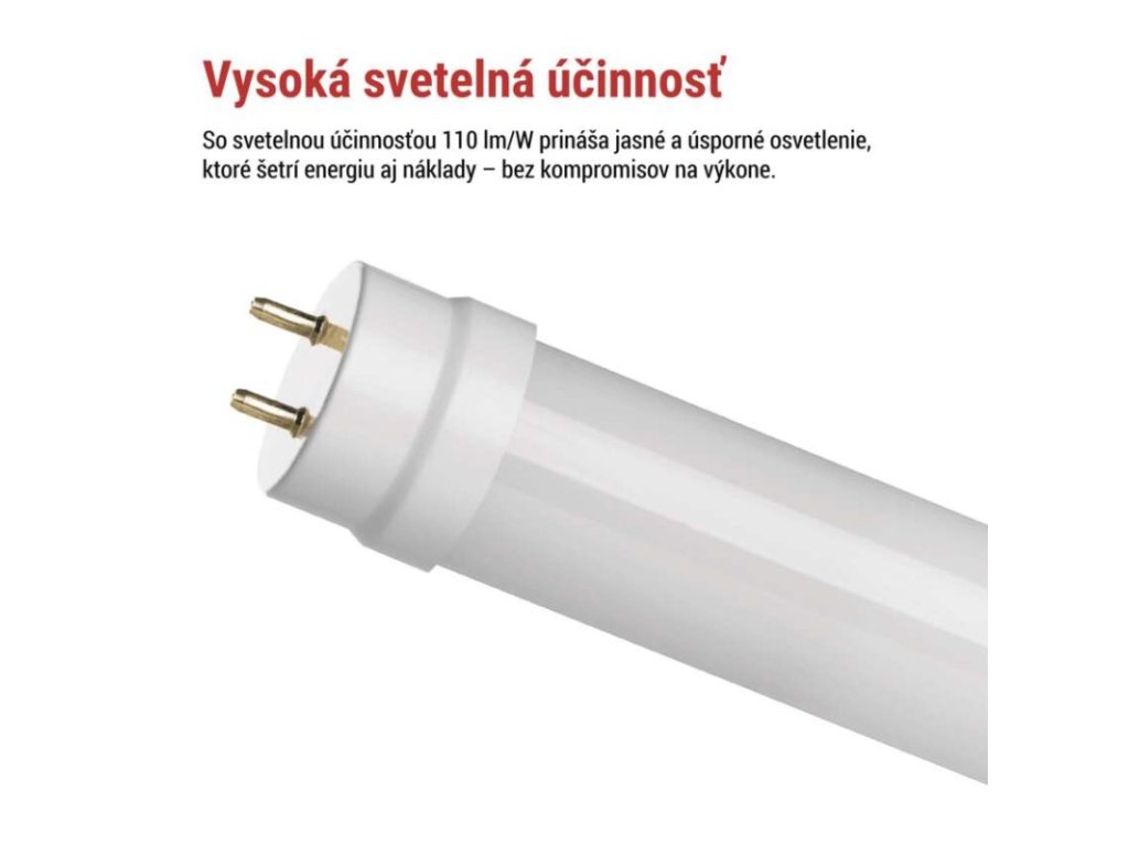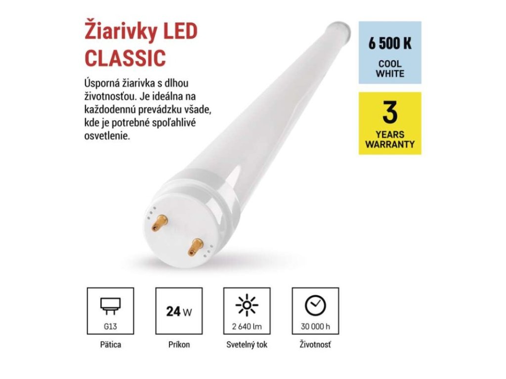 energetická trieda: E|farba svetla: studená biela|frekvencia: #|index podania farieb (CRI): Ra >80|kompatibilita: –|náhrada za žiarovku: neuvádza sa|napätie: 230 V~/50 Hz|notifikácie do mobilnej aplikácie: –|ovládanie hlasovými asistentmi: –|pätica (uchytenie žiarovky): G13|počet čipov: neuvádza sa|počet spínacích cyklov: 20 000|podporované OS: –|predajný obal: 25 ks, krabička|prenosová frekvencia: –|príkon: 24 W|protokol: –|rada: CLASSIC|rozmer: 1 500 × 26 × 26 mm|stmievateľná: nie|svetelná účinnosť: 110 lm/W|svetelný tok: 2 640 lm|technológia: LED|teplota chromatičnosti: 6 500 K|tvar: T8|typ čipov: SMD|účinník: 0,5|uhol vyžarovania: 260°|záručná doba: 3 roky|životnosť: 30 000 hodínDodatočné parametre