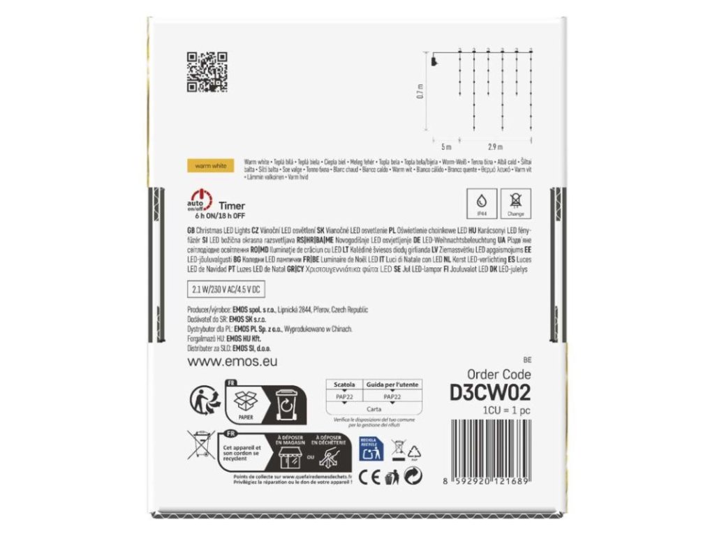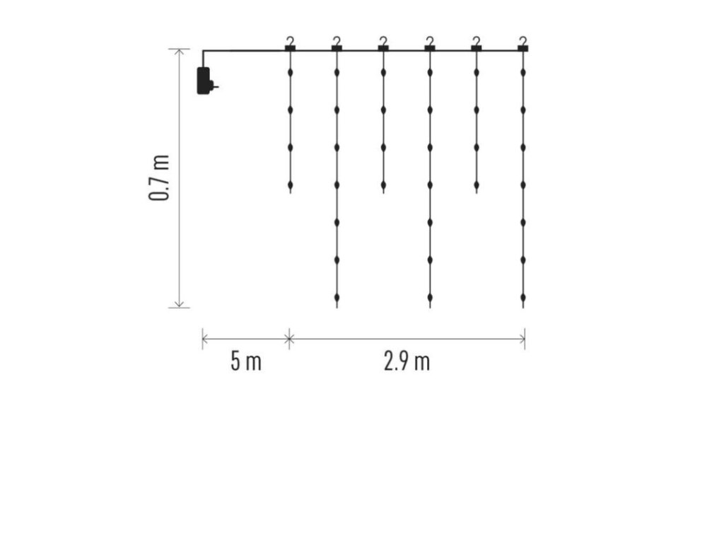 časovač: áno|ďalšie funkcie: –|diaľkový ovládač: nie|dĺžka prívodu: 5 m|farba drôtu: transparentná|farba svetla: teplá biela|funkcia: 8 módov (multifunkcie)|jazyky aplikácie: –|kompatibilita: –|krytie: IP44|LED medzera: neuvádza sa|materiál: PVC|možnosť prepojenia: nie|notifikácie do mobilnej aplikácie: #|ovládanie hlasovými asistentmi: #|počet LED: 100|podporované operačné systémy: –|použitie: vonkajšie aj vnútorné|predajný obal: 1 ks, krabica|prenosová frekvencia: –|pre výšku stromu: neuvádza sa|príkon: 2,1 W|produkt: kvaple|protokol: –|rozmer: 2,9 × 0,7 m|tvar: drop|typ napájania: sieťový adaptér|veľkosť LED: neuvádza sa|vstupné napätie: 230 V AC|výstupné napätie: 4,5 V DC|záručná doba: 2 roky|životnosť: 10 000 hodínDodatočné parametre