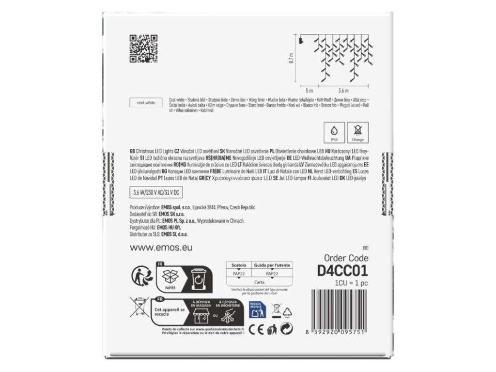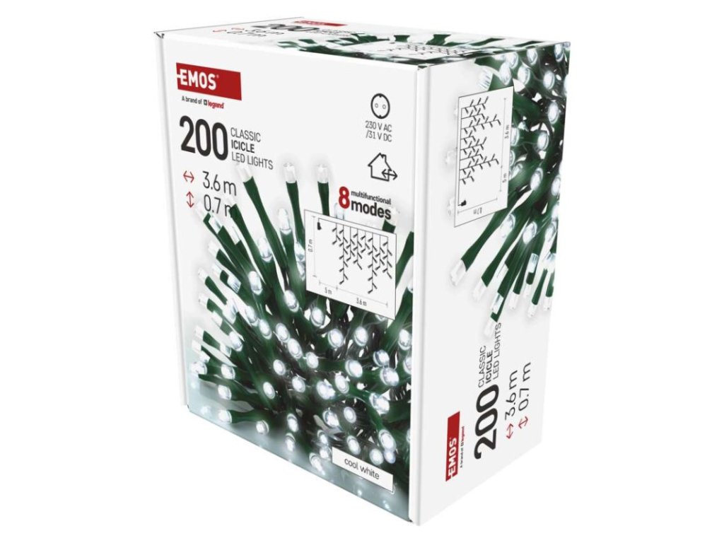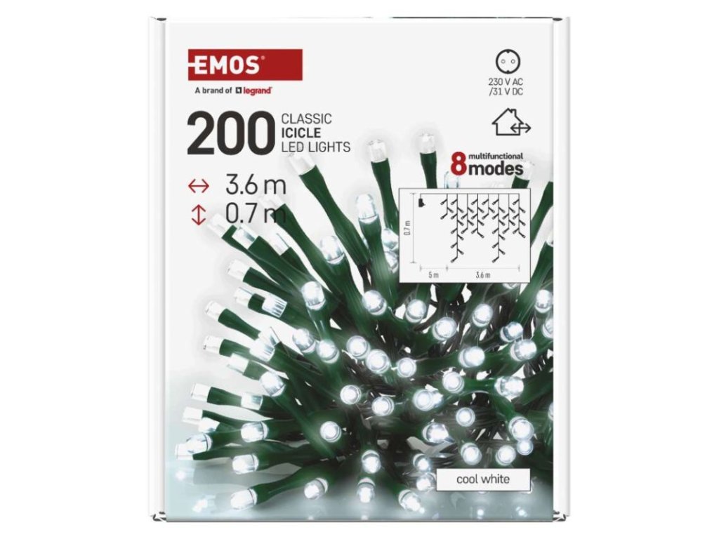 časovač: nie|diaľkový ovládač: nie|dĺžka prívodu: 5 m|farba drôtu: zelená|farba svetla: studená biela|funkcia: 8 módov (multifunkcie)|krytie: IP44|LED medzera: 10 cm|materiál: PVC|možnosť prepojenia: nie|počet LED: 200|použitie: vonkajšie aj vnútorné|predajný obal: 1 ks, krabica|pre výšku stromu: neuvádza sa|príkon: 3,6 W|produkt: kvaple|rozmer: 3,6 × 0,7 m|tvar: klasický|typ napájania: sieťový adaptér|veľkosť LED: 5 mm|vstupné napätie: 230 V AC|výstupné napätie: 31 V DC|záručná doba: 2 roky|životnosť: 10 000 hodínDodatočné parametre