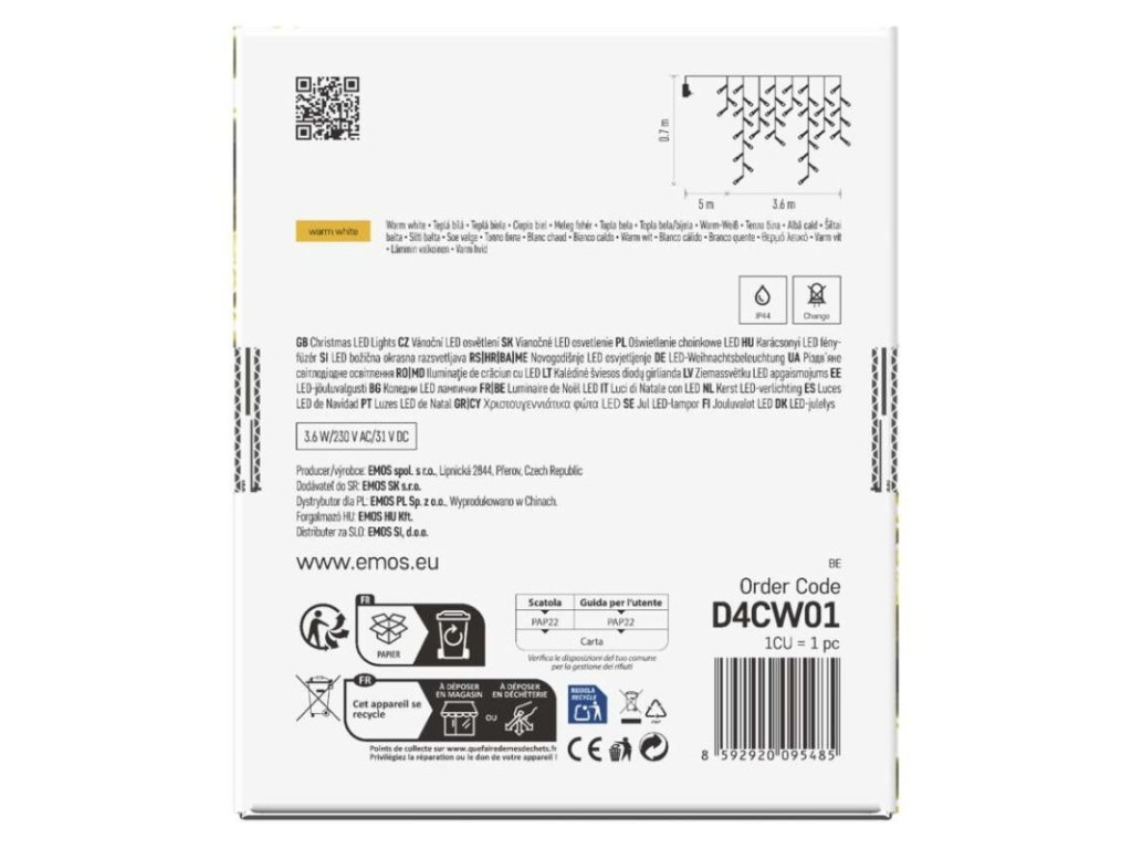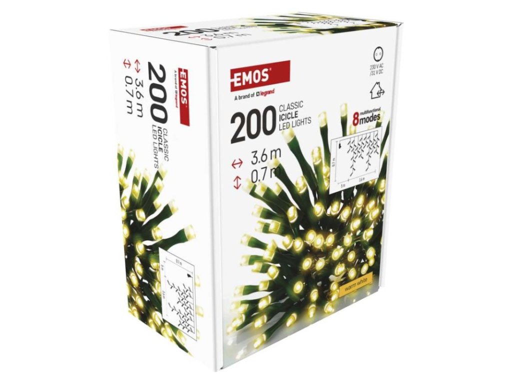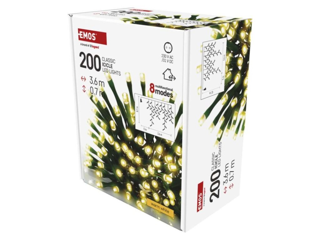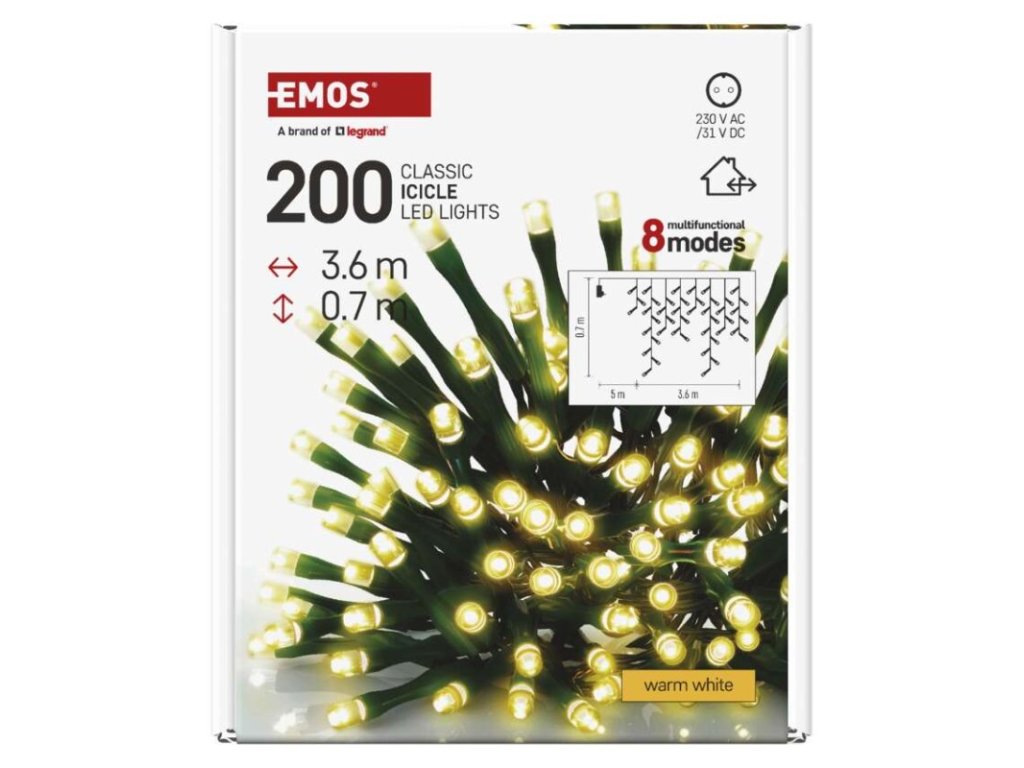 časovač: nie|ďalšie funkcie: –|diaľkový ovládač: nie|dĺžka prívodu: 5 m|farba drôtu: zelená|farba svetla: teplá biela|funkcia: 8 módov (multifunkcie)|jazyky aplikácie: –|kompatibilita: –|krytie: IP44|LED medzera: 10 cm|materiál: PVC|možnosť prepojenia: nie|notifikácie do mobilnej aplikácie: –|ovládanie hlasovými asistentmi: –|počet LED: 200|podporované operačné systémy: –|použitie: vonkajšie aj vnútorné|predajný obal: 1 ks, krabica|prenosová frekvencia: –|pre výšku stromu: neuvádza sa|príkon: 3,6 W|produkt: kvaple|protokol: –|rozmer: 3,6 × 0,7 m|tvar: klasický|typ napájania: sieťový adaptér|veľkosť LED: 5 mm|vstupné napätie: 230 V AC|výstupné napätie: 31 V DC|záručná doba: 2 roky|životnosť: 10 000 hodínDodatočné parametre