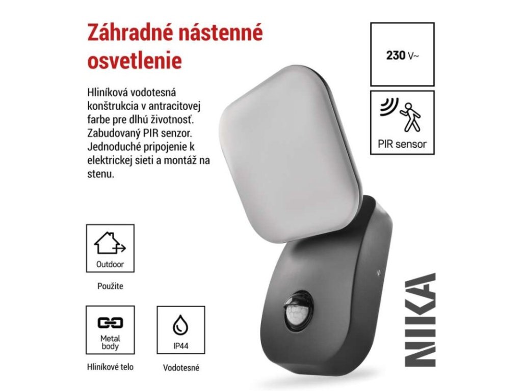 energetická trieda použitého zdroja svetla: G|farba: antracit|farba svetla: Teplá biela|fotovoltaický článok: nie|frekvencia: 50/60 Hz|index podania farieb (CRI): > 80|kategória: CLASSIC|krytie: IP44|materiál: hliník|materiál difúzora: plast|napájanie: 230 V AC|napätie: 220-240 V~|pätica (uchytenie žiarovky): –|predajný obal: 1 ks, krabička|príkon: 12,8 W|rada: NIKA|rozmer: 120 × 120 × 200 mm|rozsah pracovnej teploty: -20 ~ +40 °C|Rozsah snímača PIR: 8 m|senzor PIR: áno|súmrakový spínač: áno|svetelný tok: 900 lm|teplota chromatičnosti: 3000 K|vstavaný vypínač: nie|zdroj svetla: LED|žiarovka súčasťou balenia: –|životnosť: 25 000 hDodatočné parametre