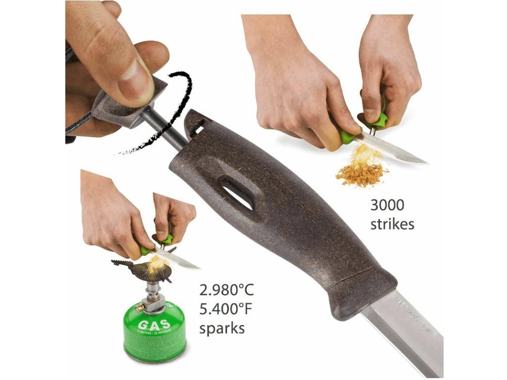 Nôž má pevnú čepeľ s hladkou hranou z nehrdzavejúcej ocele. Ergonomická rukoväť je z odolného bioplastu, v ktorej je ukryté kresadlo so šnúrkou.